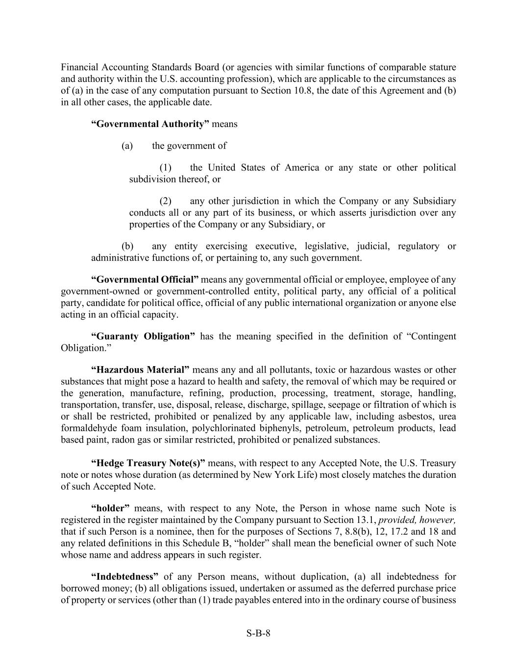S-B-8 Financial Accounting Standards Board (or agencies with similar functions of comparable stature and authority within the U.S. accounting profession), which are applicable to the circumstances as of (a) in the case of any computation pursuant to Section 10.8, the date of this Agreement and (b) in all other cases, the applicable date. “Governmental Authority” means (a) the government of (1) the United States of America or any state or other political subdivision thereof, or (2) any other jurisdiction in which the Company or any Subsidiary conducts all or any part of its business, or which asserts jurisdiction over any properties of the Company or any Subsidiary, or (b) any entity exercising executive, legislative, judicial, regulatory or administrative functions of, or pertaining to, any such government. “Governmental Official” means any governmental official or employee, employee of any government-owned or government-controlled entity, political party, any official of a political party, candidate for political office, official of any public international organization or anyone else acting in an official capacity. “Guaranty Obligation” has the meaning specified in the definition of “Contingent Obligation.” “Hazardous Material” means any and all pollutants, toxic or hazardous wastes or other substances that might pose a hazard to health and safety, the removal of which may be required or the generation, manufacture, refining, production, processing, treatment, storage, handling, transportation, transfer, use, disposal, release, discharge, spillage, seepage or filtration of which is or shall be restricted, prohibited or penalized by any applicable law, including asbestos, urea formaldehyde foam insulation, polychlorinated biphenyls, petroleum, petroleum products, lead based paint, radon gas or similar restricted, prohibited or penalized substances. “Hedge Treasury Note(s)” means, with respect to any Accepted Note, the U.S. Treasury note or notes whose duration (as determined by New York Life) most closely matches the duration of such Accepted Note. “holder” means, with respect to any Note, the Person in whose name such Note is registered in the register maintained by the Company pursuant to Section 13.1, provided, however, that if such Person is a nominee, then for the purposes of Sections 7, 8.8(b), 12, 17.2 and 18 and any related definitions in this Schedule B, “holder” shall mean the beneficial owner of such Note whose name and address appears in such register. “Indebtedness” of any Person means, without duplication, (a) all indebtedness for borrowed money; (b) all obligations issued, undertaken or assumed as the deferred purchase price of property or services (other than (1) trade payables entered into in the ordinary course of business