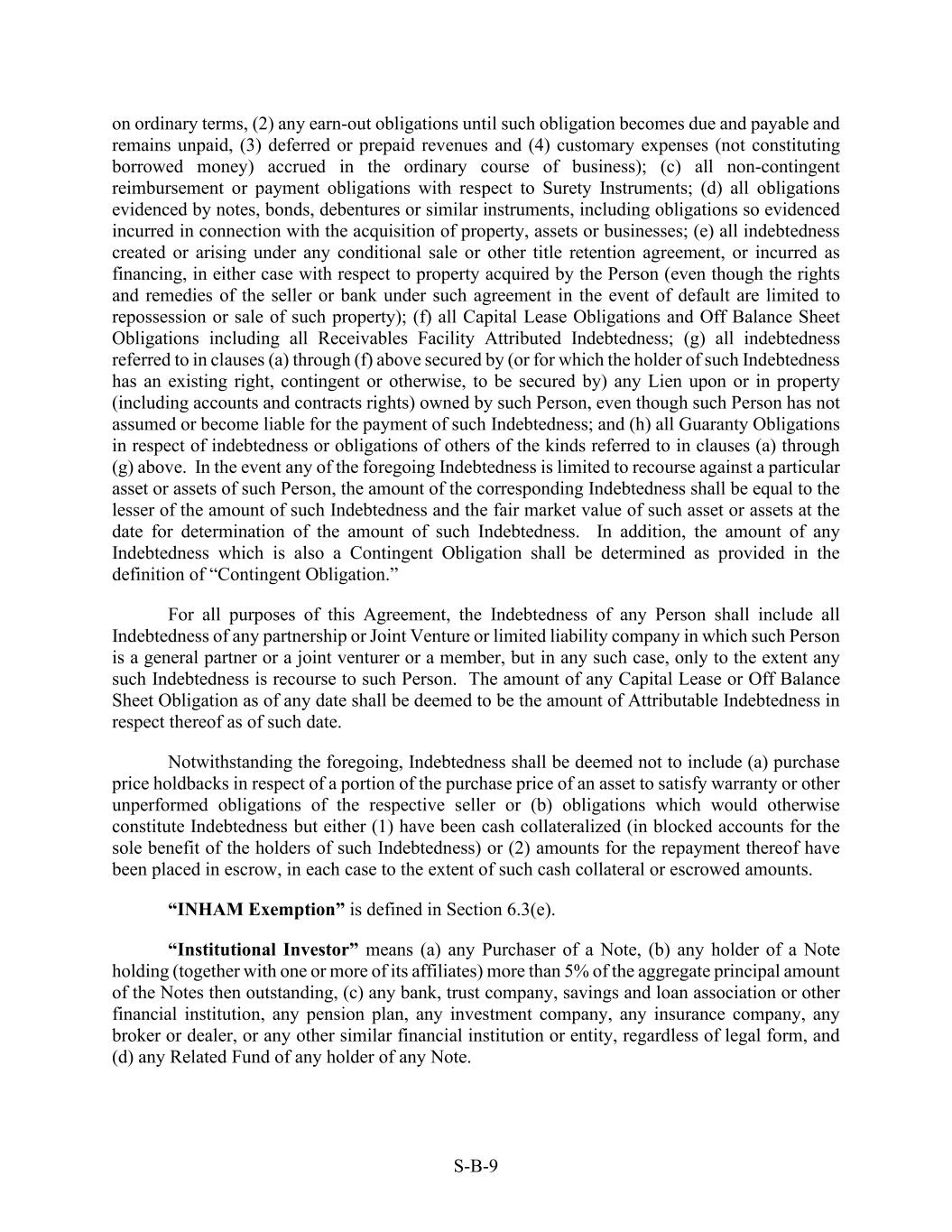 S-B-9 on ordinary terms, (2) any earn-out obligations until such obligation becomes due and payable and remains unpaid, (3) deferred or prepaid revenues and (4) customary expenses (not constituting borrowed money) accrued in the ordinary course of business); (c) all non-contingent reimbursement or payment obligations with respect to Surety Instruments; (d) all obligations evidenced by notes, bonds, debentures or similar instruments, including obligations so evidenced incurred in connection with the acquisition of property, assets or businesses; (e) all indebtedness created or arising under any conditional sale or other title retention agreement, or incurred as financing, in either case with respect to property acquired by the Person (even though the rights and remedies of the seller or bank under such agreement in the event of default are limited to repossession or sale of such property); (f) all Capital Lease Obligations and Off Balance Sheet Obligations including all Receivables Facility Attributed Indebtedness; (g) all indebtedness referred to in clauses (a) through (f) above secured by (or for which the holder of such Indebtedness has an existing right, contingent or otherwise, to be secured by) any Lien upon or in property (including accounts and contracts rights) owned by such Person, even though such Person has not assumed or become liable for the payment of such Indebtedness; and (h) all Guaranty Obligations in respect of indebtedness or obligations of others of the kinds referred to in clauses (a) through (g) above. In the event any of the foregoing Indebtedness is limited to recourse against a particular asset or assets of such Person, the amount of the corresponding Indebtedness shall be equal to the lesser of the amount of such Indebtedness and the fair market value of such asset or assets at the date for determination of the amount of such Indebtedness. In addition, the amount of any Indebtedness which is also a Contingent Obligation shall be determined as provided in the definition of “Contingent Obligation.” For all purposes of this Agreement, the Indebtedness of any Person shall include all Indebtedness of any partnership or Joint Venture or limited liability company in which such Person is a general partner or a joint venturer or a member, but in any such case, only to the extent any such Indebtedness is recourse to such Person. The amount of any Capital Lease or Off Balance Sheet Obligation as of any date shall be deemed to be the amount of Attributable Indebtedness in respect thereof as of such date. Notwithstanding the foregoing, Indebtedness shall be deemed not to include (a) purchase price holdbacks in respect of a portion of the purchase price of an asset to satisfy warranty or other unperformed obligations of the respective seller or (b) obligations which would otherwise constitute Indebtedness but either (1) have been cash collateralized (in blocked accounts for the sole benefit of the holders of such Indebtedness) or (2) amounts for the repayment thereof have been placed in escrow, in each case to the extent of such cash collateral or escrowed amounts. “INHAM Exemption” is defined in Section 6.3(e). “Institutional Investor” means (a) any Purchaser of a Note, (b) any holder of a Note holding (together with one or more of its affiliates) more than 5% of the aggregate principal amount of the Notes then outstanding, (c) any bank, trust company, savings and loan association or other financial institution, any pension plan, any investment company, any insurance company, any broker or dealer, or any other similar financial institution or entity, regardless of legal form, and (d) any Related Fund of any holder of any Note.