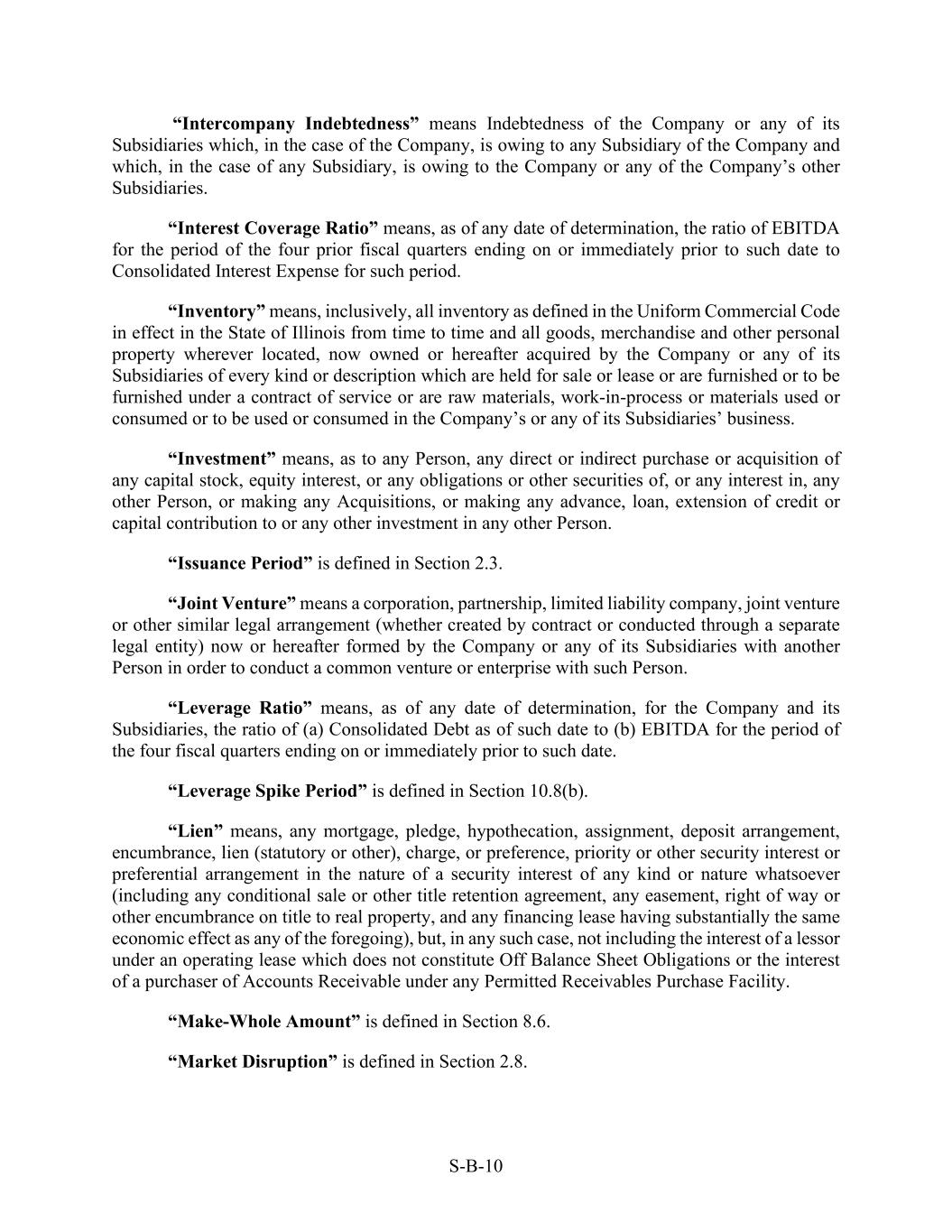 S-B-10 “Intercompany Indebtedness” means Indebtedness of the Company or any of its Subsidiaries which, in the case of the Company, is owing to any Subsidiary of the Company and which, in the case of any Subsidiary, is owing to the Company or any of the Company’s other Subsidiaries. “Interest Coverage Ratio” means, as of any date of determination, the ratio of EBITDA for the period of the four prior fiscal quarters ending on or immediately prior to such date to Consolidated Interest Expense for such period. “Inventory” means, inclusively, all inventory as defined in the Uniform Commercial Code in effect in the State of Illinois from time to time and all goods, merchandise and other personal property wherever located, now owned or hereafter acquired by the Company or any of its Subsidiaries of every kind or description which are held for sale or lease or are furnished or to be furnished under a contract of service or are raw materials, work-in-process or materials used or consumed or to be used or consumed in the Company’s or any of its Subsidiaries’ business. “Investment” means, as to any Person, any direct or indirect purchase or acquisition of any capital stock, equity interest, or any obligations or other securities of, or any interest in, any other Person, or making any Acquisitions, or making any advance, loan, extension of credit or capital contribution to or any other investment in any other Person. “Issuance Period” is defined in Section 2.3. “Joint Venture” means a corporation, partnership, limited liability company, joint venture or other similar legal arrangement (whether created by contract or conducted through a separate legal entity) now or hereafter formed by the Company or any of its Subsidiaries with another Person in order to conduct a common venture or enterprise with such Person. “Leverage Ratio” means, as of any date of determination, for the Company and its Subsidiaries, the ratio of (a) Consolidated Debt as of such date to (b) EBITDA for the period of the four fiscal quarters ending on or immediately prior to such date. “Leverage Spike Period” is defined in Section 10.8(b). “Lien” means, any mortgage, pledge, hypothecation, assignment, deposit arrangement, encumbrance, lien (statutory or other), charge, or preference, priority or other security interest or preferential arrangement in the nature of a security interest of any kind or nature whatsoever (including any conditional sale or other title retention agreement, any easement, right of way or other encumbrance on title to real property, and any financing lease having substantially the same economic effect as any of the foregoing), but, in any such case, not including the interest of a lessor under an operating lease which does not constitute Off Balance Sheet Obligations or the interest of a purchaser of Accounts Receivable under any Permitted Receivables Purchase Facility. “Make-Whole Amount” is defined in Section 8.6. “Market Disruption” is defined in Section 2.8.