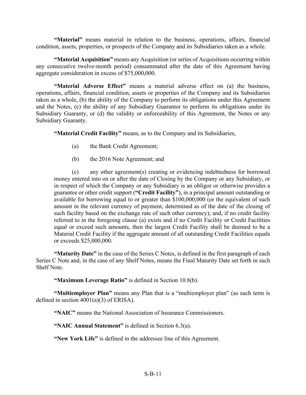 S-B-11 “Material” means material in relation to the business, operations, affairs, financial condition, assets, properties, or prospects of the Company and its Subsidiaries taken as a whole. “Material Acquisition” means any Acquisition (or series of Acquisitions occurring within any consecutive twelve-month period) consummated after the date of this Agreement having aggregate consideration in excess of $75,000,000. “Material Adverse Effect” means a material adverse effect on (a) the business, operations, affairs, financial condition, assets or properties of the Company and its Subsidiaries taken as a whole, (b) the ability of the Company to perform its obligations under this Agreement and the Notes, (c) the ability of any Subsidiary Guarantor to perform its obligations under its Subsidiary Guaranty, or (d) the validity or enforceability of this Agreement, the Notes or any Subsidiary Guaranty. “Material Credit Facility” means, as to the Company and its Subsidiaries, (a) the Bank Credit Agreement; (b) the 2016 Note Agreement; and (c) any other agreement(s) creating or evidencing indebtedness for borrowed money entered into on or after the date of Closing by the Company or any Subsidiary, or in respect of which the Company or any Subsidiary is an obligor or otherwise provides a guarantee or other credit support (“Credit Facility”), in a principal amount outstanding or available for borrowing equal to or greater than $100,000,000 (or the equivalent of such amount in the relevant currency of payment, determined as of the date of the closing of such facility based on the exchange rate of such other currency); and, if no credit facility referred to in the foregoing clause (a) exists and if no Credit Facility or Credit Facilities equal or exceed such amounts, then the largest Credit Facility shall be deemed to be a Material Credit Facility if the aggregate amount of all outstanding Credit Facilities equals or exceeds $25,000,000. “Maturity Date” in the case of the Series C Notes, is defined in the first paragraph of each Series C Note and, in the case of any Shelf Notes, means the Final Maturity Date set forth in such Shelf Note. “Maximum Leverage Ratio” is defined in Section 10.8(b). “Multiemployer Plan” means any Plan that is a “multiemployer plan” (as such term is defined in section 4001(a)(3) of ERISA). “NAIC” means the National Association of Insurance Commissioners. “NAIC Annual Statement” is defined in Section 6.3(a). “New York Life” is defined in the addressee line of this Agreement.