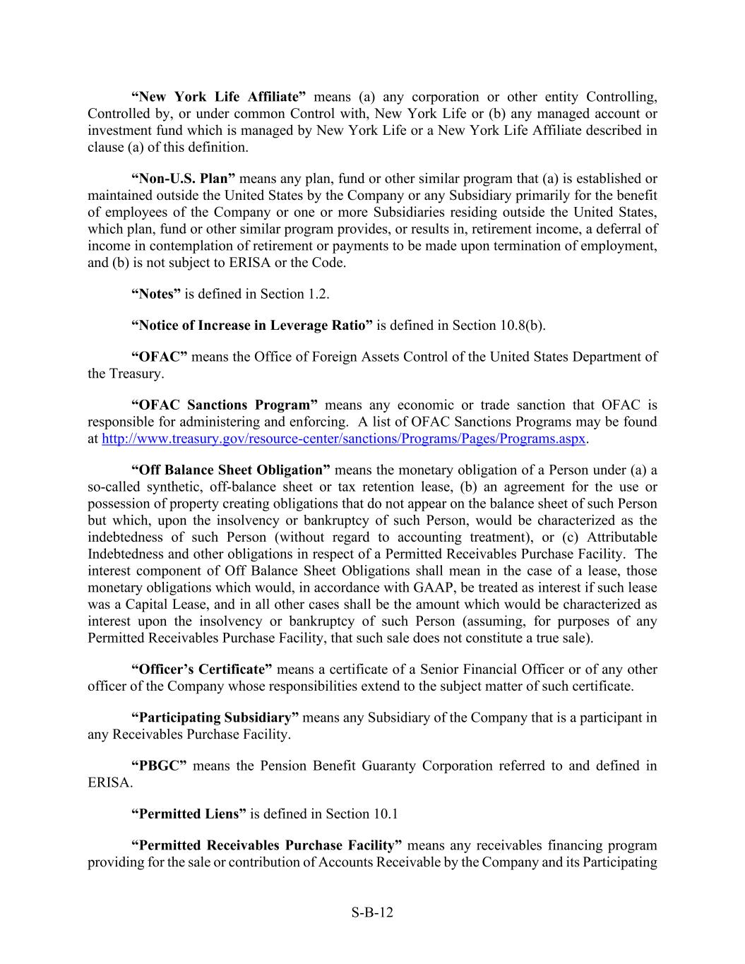 S-B-12 “New York Life Affiliate” means (a) any corporation or other entity Controlling, Controlled by, or under common Control with, New York Life or (b) any managed account or investment fund which is managed by New York Life or a New York Life Affiliate described in clause (a) of this definition. “Non-U.S. Plan” means any plan, fund or other similar program that (a) is established or maintained outside the United States by the Company or any Subsidiary primarily for the benefit of employees of the Company or one or more Subsidiaries residing outside the United States, which plan, fund or other similar program provides, or results in, retirement income, a deferral of income in contemplation of retirement or payments to be made upon termination of employment, and (b) is not subject to ERISA or the Code. “Notes” is defined in Section 1.2. “Notice of Increase in Leverage Ratio” is defined in Section 10.8(b). “OFAC” means the Office of Foreign Assets Control of the United States Department of the Treasury. “OFAC Sanctions Program” means any economic or trade sanction that OFAC is responsible for administering and enforcing. A list of OFAC Sanctions Programs may be found at http://www.treasury.gov/resource-center/sanctions/Programs/Pages/Programs.aspx. “Off Balance Sheet Obligation” means the monetary obligation of a Person under (a) a so-called synthetic, off-balance sheet or tax retention lease, (b) an agreement for the use or possession of property creating obligations that do not appear on the balance sheet of such Person but which, upon the insolvency or bankruptcy of such Person, would be characterized as the indebtedness of such Person (without regard to accounting treatment), or (c) Attributable Indebtedness and other obligations in respect of a Permitted Receivables Purchase Facility. The interest component of Off Balance Sheet Obligations shall mean in the case of a lease, those monetary obligations which would, in accordance with GAAP, be treated as interest if such lease was a Capital Lease, and in all other cases shall be the amount which would be characterized as interest upon the insolvency or bankruptcy of such Person (assuming, for purposes of any Permitted Receivables Purchase Facility, that such sale does not constitute a true sale). “Officer’s Certificate” means a certificate of a Senior Financial Officer or of any other officer of the Company whose responsibilities extend to the subject matter of such certificate. “Participating Subsidiary” means any Subsidiary of the Company that is a participant in any Receivables Purchase Facility. “PBGC” means the Pension Benefit Guaranty Corporation referred to and defined in ERISA. “Permitted Liens” is defined in Section 10.1 “Permitted Receivables Purchase Facility” means any receivables financing program providing for the sale or contribution of Accounts Receivable by the Company and its Participating