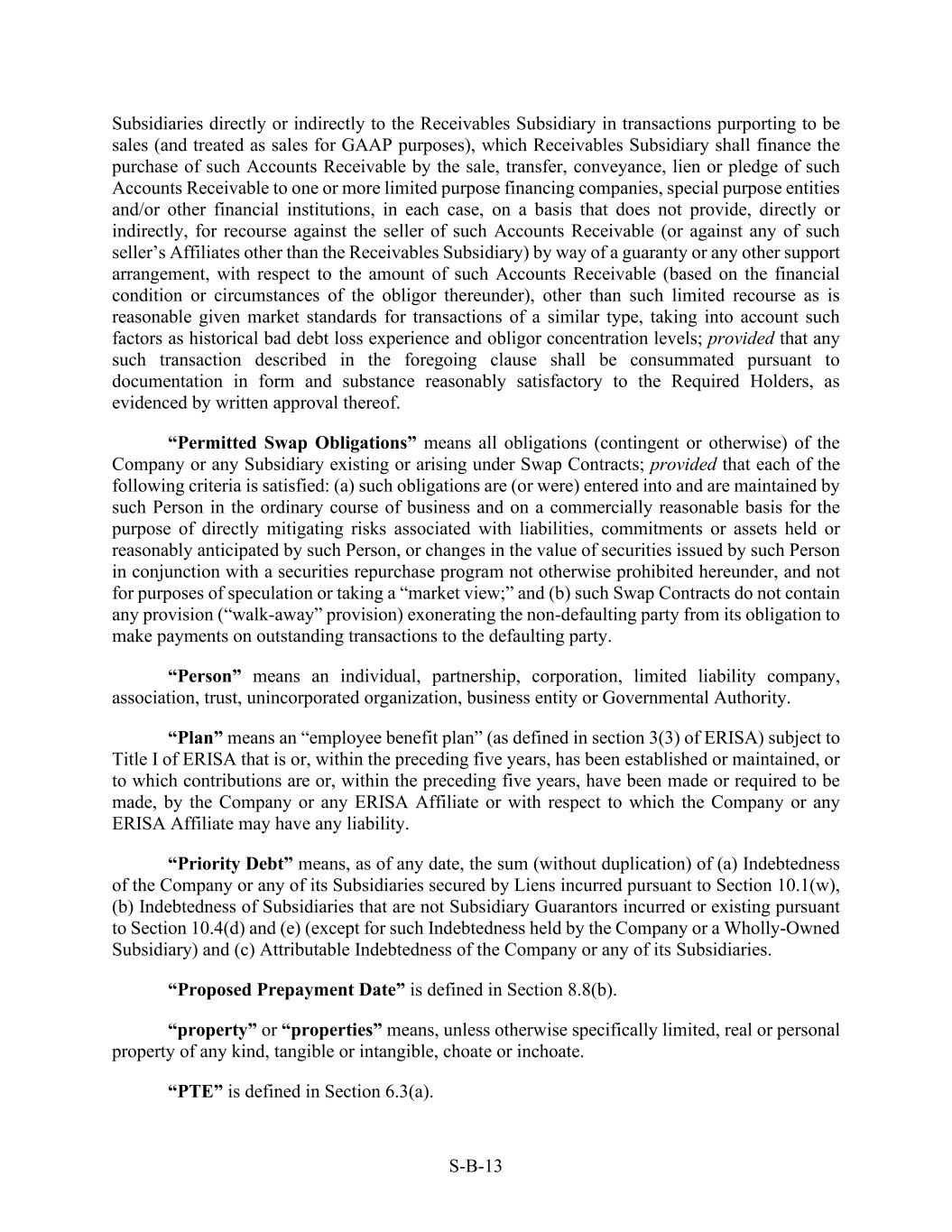 S-B-13 Subsidiaries directly or indirectly to the Receivables Subsidiary in transactions purporting to be sales (and treated as sales for GAAP purposes), which Receivables Subsidiary shall finance the purchase of such Accounts Receivable by the sale, transfer, conveyance, lien or pledge of such Accounts Receivable to one or more limited purpose financing companies, special purpose entities and/or other financial institutions, in each case, on a basis that does not provide, directly or indirectly, for recourse against the seller of such Accounts Receivable (or against any of such seller’s Affiliates other than the Receivables Subsidiary) by way of a guaranty or any other support arrangement, with respect to the amount of such Accounts Receivable (based on the financial condition or circumstances of the obligor thereunder), other than such limited recourse as is reasonable given market standards for transactions of a similar type, taking into account such factors as historical bad debt loss experience and obligor concentration levels; provided that any such transaction described in the foregoing clause shall be consummated pursuant to documentation in form and substance reasonably satisfactory to the Required Holders, as evidenced by written approval thereof. “Permitted Swap Obligations” means all obligations (contingent or otherwise) of the Company or any Subsidiary existing or arising under Swap Contracts; provided that each of the following criteria is satisfied: (a) such obligations are (or were) entered into and are maintained by such Person in the ordinary course of business and on a commercially reasonable basis for the purpose of directly mitigating risks associated with liabilities, commitments or assets held or reasonably anticipated by such Person, or changes in the value of securities issued by such Person in conjunction with a securities repurchase program not otherwise prohibited hereunder, and not for purposes of speculation or taking a “market view;” and (b) such Swap Contracts do not contain any provision (“walk-away” provision) exonerating the non-defaulting party from its obligation to make payments on outstanding transactions to the defaulting party. “Person” means an individual, partnership, corporation, limited liability company, association, trust, unincorporated organization, business entity or Governmental Authority. “Plan” means an “employee benefit plan” (as defined in section 3(3) of ERISA) subject to Title I of ERISA that is or, within the preceding five years, has been established or maintained, or to which contributions are or, within the preceding five years, have been made or required to be made, by the Company or any ERISA Affiliate or with respect to which the Company or any ERISA Affiliate may have any liability. “Priority Debt” means, as of any date, the sum (without duplication) of (a) Indebtedness of the Company or any of its Subsidiaries secured by Liens incurred pursuant to Section 10.1(w), (b) Indebtedness of Subsidiaries that are not Subsidiary Guarantors incurred or existing pursuant to Section 10.4(d) and (e) (except for such Indebtedness held by the Company or a Wholly-Owned Subsidiary) and (c) Attributable Indebtedness of the Company or any of its Subsidiaries. “Proposed Prepayment Date” is defined in Section 8.8(b). “property” or “properties” means, unless otherwise specifically limited, real or personal property of any kind, tangible or intangible, choate or inchoate. “PTE” is defined in Section 6.3(a).