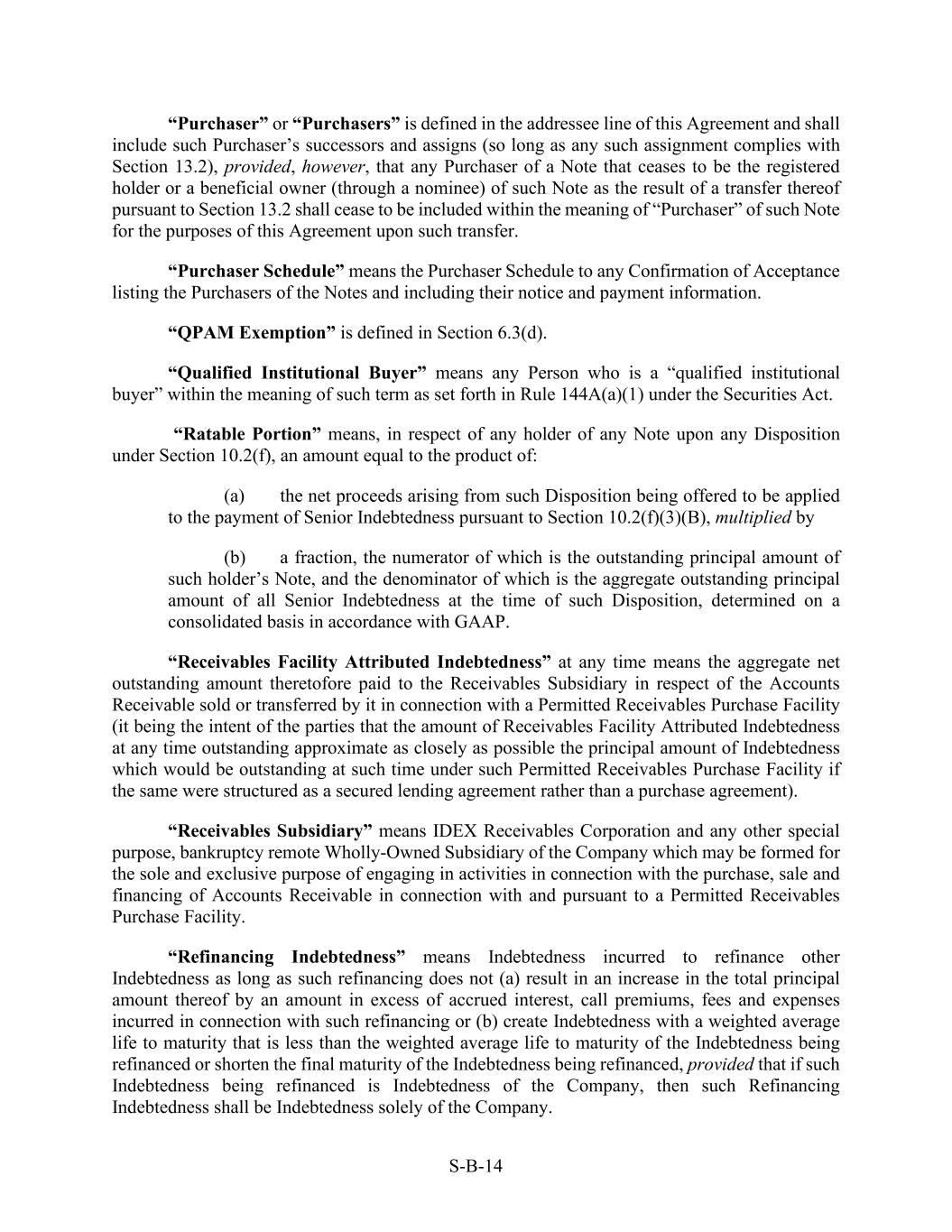 S-B-14 “Purchaser” or “Purchasers” is defined in the addressee line of this Agreement and shall include such Purchaser’s successors and assigns (so long as any such assignment complies with Section 13.2), provided, however, that any Purchaser of a Note that ceases to be the registered holder or a beneficial owner (through a nominee) of such Note as the result of a transfer thereof pursuant to Section 13.2 shall cease to be included within the meaning of “Purchaser” of such Note for the purposes of this Agreement upon such transfer. “Purchaser Schedule” means the Purchaser Schedule to any Confirmation of Acceptance listing the Purchasers of the Notes and including their notice and payment information. “QPAM Exemption” is defined in Section 6.3(d). “Qualified Institutional Buyer” means any Person who is a “qualified institutional buyer” within the meaning of such term as set forth in Rule 144A(a)(1) under the Securities Act. “Ratable Portion” means, in respect of any holder of any Note upon any Disposition under Section 10.2(f), an amount equal to the product of: (a) the net proceeds arising from such Disposition being offered to be applied to the payment of Senior Indebtedness pursuant to Section 10.2(f)(3)(B), multiplied by (b) a fraction, the numerator of which is the outstanding principal amount of such holder’s Note, and the denominator of which is the aggregate outstanding principal amount of all Senior Indebtedness at the time of such Disposition, determined on a consolidated basis in accordance with GAAP. “Receivables Facility Attributed Indebtedness” at any time means the aggregate net outstanding amount theretofore paid to the Receivables Subsidiary in respect of the Accounts Receivable sold or transferred by it in connection with a Permitted Receivables Purchase Facility (it being the intent of the parties that the amount of Receivables Facility Attributed Indebtedness at any time outstanding approximate as closely as possible the principal amount of Indebtedness which would be outstanding at such time under such Permitted Receivables Purchase Facility if the same were structured as a secured lending agreement rather than a purchase agreement). “Receivables Subsidiary” means IDEX Receivables Corporation and any other special purpose, bankruptcy remote Wholly-Owned Subsidiary of the Company which may be formed for the sole and exclusive purpose of engaging in activities in connection with the purchase, sale and financing of Accounts Receivable in connection with and pursuant to a Permitted Receivables Purchase Facility. “Refinancing Indebtedness” means Indebtedness incurred to refinance other Indebtedness as long as such refinancing does not (a) result in an increase in the total principal amount thereof by an amount in excess of accrued interest, call premiums, fees and expenses incurred in connection with such refinancing or (b) create Indebtedness with a weighted average life to maturity that is less than the weighted average life to maturity of the Indebtedness being refinanced or shorten the final maturity of the Indebtedness being refinanced, provided that if such Indebtedness being refinanced is Indebtedness of the Company, then such Refinancing Indebtedness shall be Indebtedness solely of the Company.