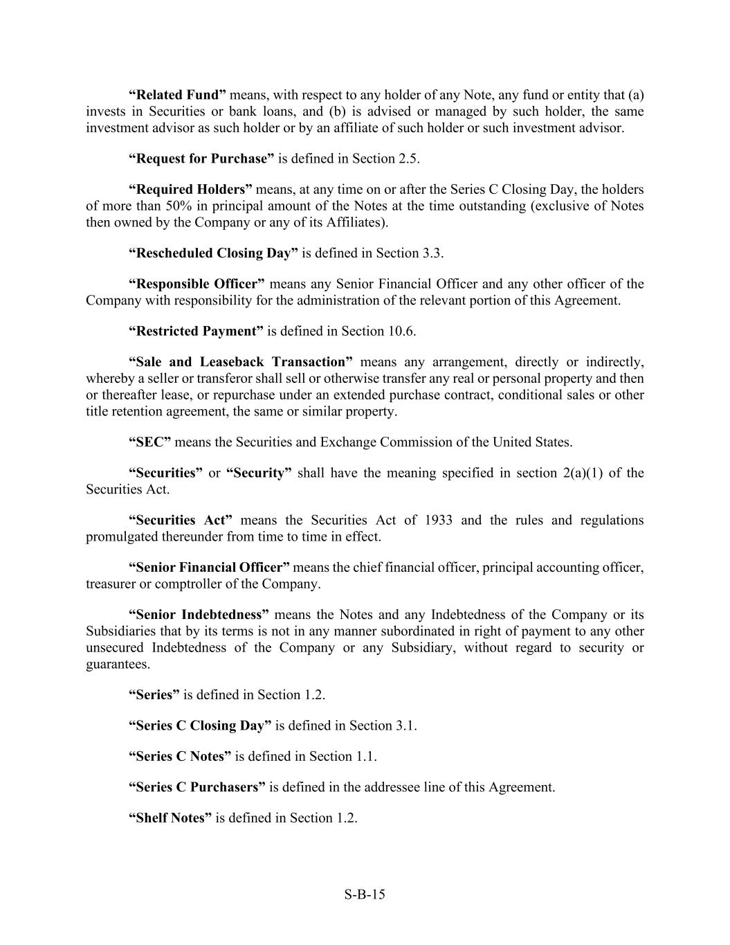 S-B-15 “Related Fund” means, with respect to any holder of any Note, any fund or entity that (a) invests in Securities or bank loans, and (b) is advised or managed by such holder, the same investment advisor as such holder or by an affiliate of such holder or such investment advisor. “Request for Purchase” is defined in Section 2.5. “Required Holders” means, at any time on or after the Series C Closing Day, the holders of more than 50% in principal amount of the Notes at the time outstanding (exclusive of Notes then owned by the Company or any of its Affiliates). “Rescheduled Closing Day” is defined in Section 3.3. “Responsible Officer” means any Senior Financial Officer and any other officer of the Company with responsibility for the administration of the relevant portion of this Agreement. “Restricted Payment” is defined in Section 10.6. “Sale and Leaseback Transaction” means any arrangement, directly or indirectly, whereby a seller or transferor shall sell or otherwise transfer any real or personal property and then or thereafter lease, or repurchase under an extended purchase contract, conditional sales or other title retention agreement, the same or similar property. “SEC” means the Securities and Exchange Commission of the United States. “Securities” or “Security” shall have the meaning specified in section 2(a)(1) of the Securities Act. “Securities Act” means the Securities Act of 1933 and the rules and regulations promulgated thereunder from time to time in effect. “Senior Financial Officer” means the chief financial officer, principal accounting officer, treasurer or comptroller of the Company. “Senior Indebtedness” means the Notes and any Indebtedness of the Company or its Subsidiaries that by its terms is not in any manner subordinated in right of payment to any other unsecured Indebtedness of the Company or any Subsidiary, without regard to security or guarantees. “Series” is defined in Section 1.2. “Series C Closing Day” is defined in Section 3.1. “Series C Notes” is defined in Section 1.1. “Series C Purchasers” is defined in the addressee line of this Agreement. “Shelf Notes” is defined in Section 1.2.