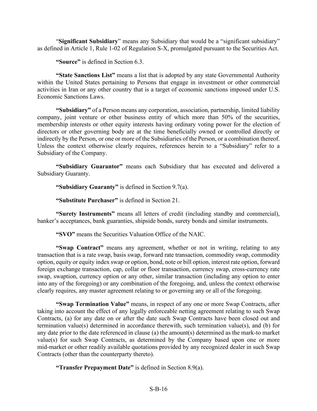 S-B-16 “Significant Subsidiary” means any Subsidiary that would be a “significant subsidiary” as defined in Article 1, Rule 1-02 of Regulation S-X, promulgated pursuant to the Securities Act. “Source” is defined in Section 6.3. “State Sanctions List” means a list that is adopted by any state Governmental Authority within the United States pertaining to Persons that engage in investment or other commercial activities in Iran or any other country that is a target of economic sanctions imposed under U.S. Economic Sanctions Laws. “Subsidiary” of a Person means any corporation, association, partnership, limited liability company, joint venture or other business entity of which more than 50% of the securities, membership interests or other equity interests having ordinary voting power for the election of directors or other governing body are at the time beneficially owned or controlled directly or indirectly by the Person, or one or more of the Subsidiaries of the Person, or a combination thereof. Unless the context otherwise clearly requires, references herein to a “Subsidiary” refer to a Subsidiary of the Company. “Subsidiary Guarantor” means each Subsidiary that has executed and delivered a Subsidiary Guaranty. “Subsidiary Guaranty” is defined in Section 9.7(a). “Substitute Purchaser” is defined in Section 21. “Surety Instruments” means all letters of credit (including standby and commercial), banker’s acceptances, bank guaranties, shipside bonds, surety bonds and similar instruments. “SVO” means the Securities Valuation Office of the NAIC. “Swap Contract” means any agreement, whether or not in writing, relating to any transaction that is a rate swap, basis swap, forward rate transaction, commodity swap, commodity option, equity or equity index swap or option, bond, note or bill option, interest rate option, forward foreign exchange transaction, cap, collar or floor transaction, currency swap, cross-currency rate swap, swaption, currency option or any other, similar transaction (including any option to enter into any of the foregoing) or any combination of the foregoing, and, unless the context otherwise clearly requires, any master agreement relating to or governing any or all of the foregoing. “Swap Termination Value” means, in respect of any one or more Swap Contracts, after taking into account the effect of any legally enforceable netting agreement relating to such Swap Contracts, (a) for any date on or after the date such Swap Contracts have been closed out and termination value(s) determined in accordance therewith, such termination value(s), and (b) for any date prior to the date referenced in clause (a) the amount(s) determined as the mark-to market value(s) for such Swap Contracts, as determined by the Company based upon one or more mid-market or other readily available quotations provided by any recognized dealer in such Swap Contracts (other than the counterparty thereto). “Transfer Prepayment Date” is defined in Section 8.9(a).