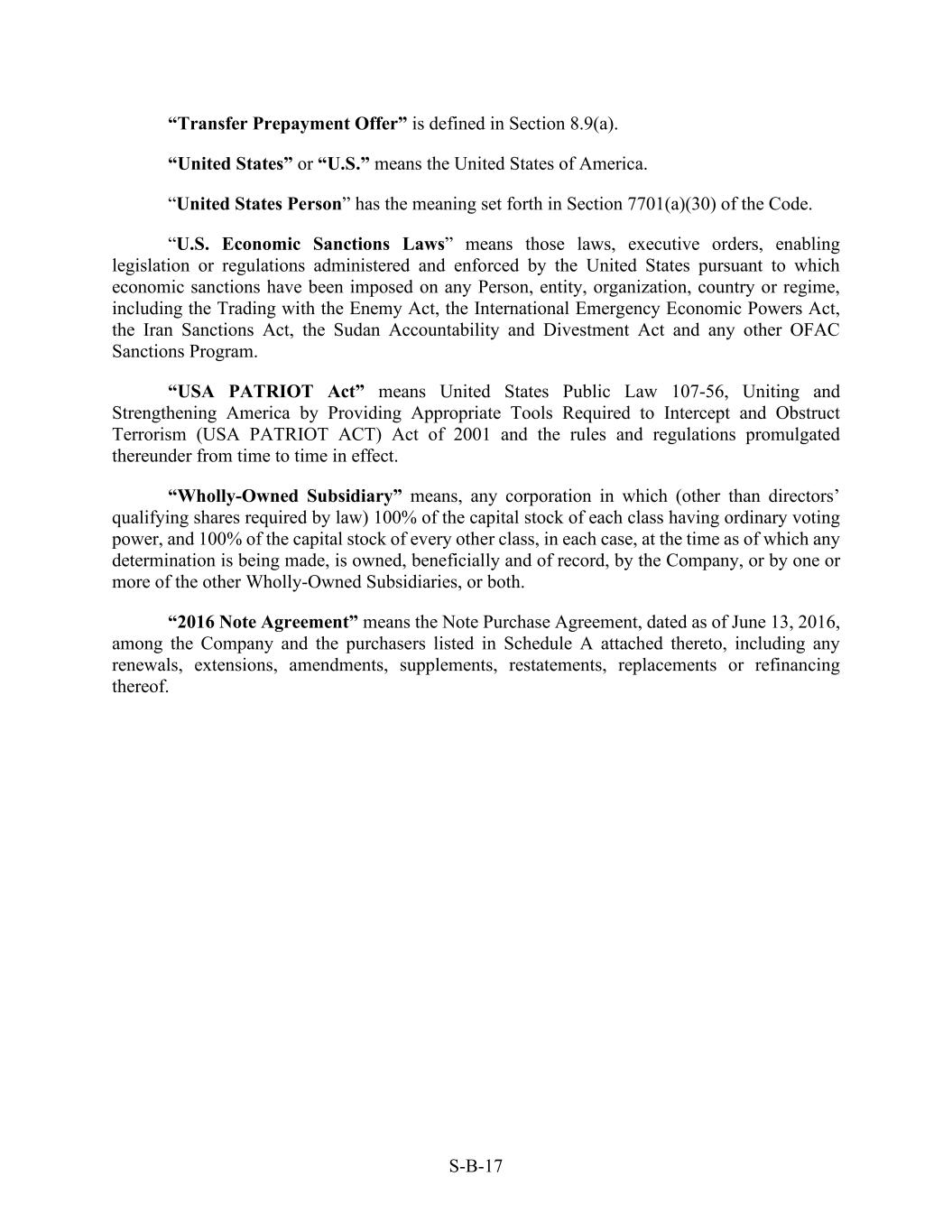 S-B-17 “Transfer Prepayment Offer” is defined in Section 8.9(a). “United States” or “U.S.” means the United States of America. “United States Person” has the meaning set forth in Section 7701(a)(30) of the Code. “U.S. Economic Sanctions Laws” means those laws, executive orders, enabling legislation or regulations administered and enforced by the United States pursuant to which economic sanctions have been imposed on any Person, entity, organization, country or regime, including the Trading with the Enemy Act, the International Emergency Economic Powers Act, the Iran Sanctions Act, the Sudan Accountability and Divestment Act and any other OFAC Sanctions Program. “USA PATRIOT Act” means United States Public Law 107-56, Uniting and Strengthening America by Providing Appropriate Tools Required to Intercept and Obstruct Terrorism (USA PATRIOT ACT) Act of 2001 and the rules and regulations promulgated thereunder from time to time in effect. “Wholly-Owned Subsidiary” means, any corporation in which (other than directors’ qualifying shares required by law) 100% of the capital stock of each class having ordinary voting power, and 100% of the capital stock of every other class, in each case, at the time as of which any determination is being made, is owned, beneficially and of record, by the Company, or by one or more of the other Wholly-Owned Subsidiaries, or both. “2016 Note Agreement” means the Note Purchase Agreement, dated as of June 13, 2016, among the Company and the purchasers listed in Schedule A attached thereto, including any renewals, extensions, amendments, supplements, restatements, replacements or refinancing thereof.