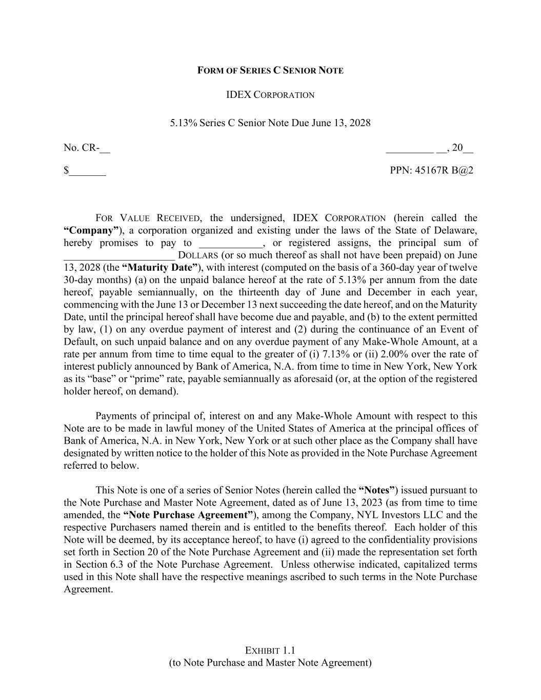 EXHIBIT 1.1 (to Note Purchase and Master Note Agreement) FORM OF SERIES C SENIOR NOTE IDEX CORPORATION 5.13% Series C Senior Note Due June 13, 2028 No. CR-__ _________ __, 20__ $_______ PPN: 45167R B@2 FOR VALUE RECEIVED, the undersigned, IDEX CORPORATION (herein called the “Company”), a corporation organized and existing under the laws of the State of Delaware, hereby promises to pay to ____________, or registered assigns, the principal sum of _____________________ DOLLARS (or so much thereof as shall not have been prepaid) on June 13, 2028 (the “Maturity Date”), with interest (computed on the basis of a 360-day year of twelve 30-day months) (a) on the unpaid balance hereof at the rate of 5.13% per annum from the date hereof, payable semiannually, on the thirteenth day of June and December in each year, commencing with the June 13 or December 13 next succeeding the date hereof, and on the Maturity Date, until the principal hereof shall have become due and payable, and (b) to the extent permitted by law, (1) on any overdue payment of interest and (2) during the continuance of an Event of Default, on such unpaid balance and on any overdue payment of any Make-Whole Amount, at a rate per annum from time to time equal to the greater of (i) 7.13% or (ii) 2.00% over the rate of interest publicly announced by Bank of America, N.A. from time to time in New York, New York as its “base” or “prime” rate, payable semiannually as aforesaid (or, at the option of the registered holder hereof, on demand). Payments of principal of, interest on and any Make-Whole Amount with respect to this Note are to be made in lawful money of the United States of America at the principal offices of Bank of America, N.A. in New York, New York or at such other place as the Company shall have designated by written notice to the holder of this Note as provided in the Note Purchase Agreement referred to below. This Note is one of a series of Senior Notes (herein called the “Notes”) issued pursuant to the Note Purchase and Master Note Agreement, dated as of June 13, 2023 (as from time to time amended, the “Note Purchase Agreement”), among the Company, NYL Investors LLC and the respective Purchasers named therein and is entitled to the benefits thereof. Each holder of this Note will be deemed, by its acceptance hereof, to have (i) agreed to the confidentiality provisions set forth in Section 20 of the Note Purchase Agreement and (ii) made the representation set forth in Section 6.3 of the Note Purchase Agreement. Unless otherwise indicated, capitalized terms used in this Note shall have the respective meanings ascribed to such terms in the Note Purchase Agreement.