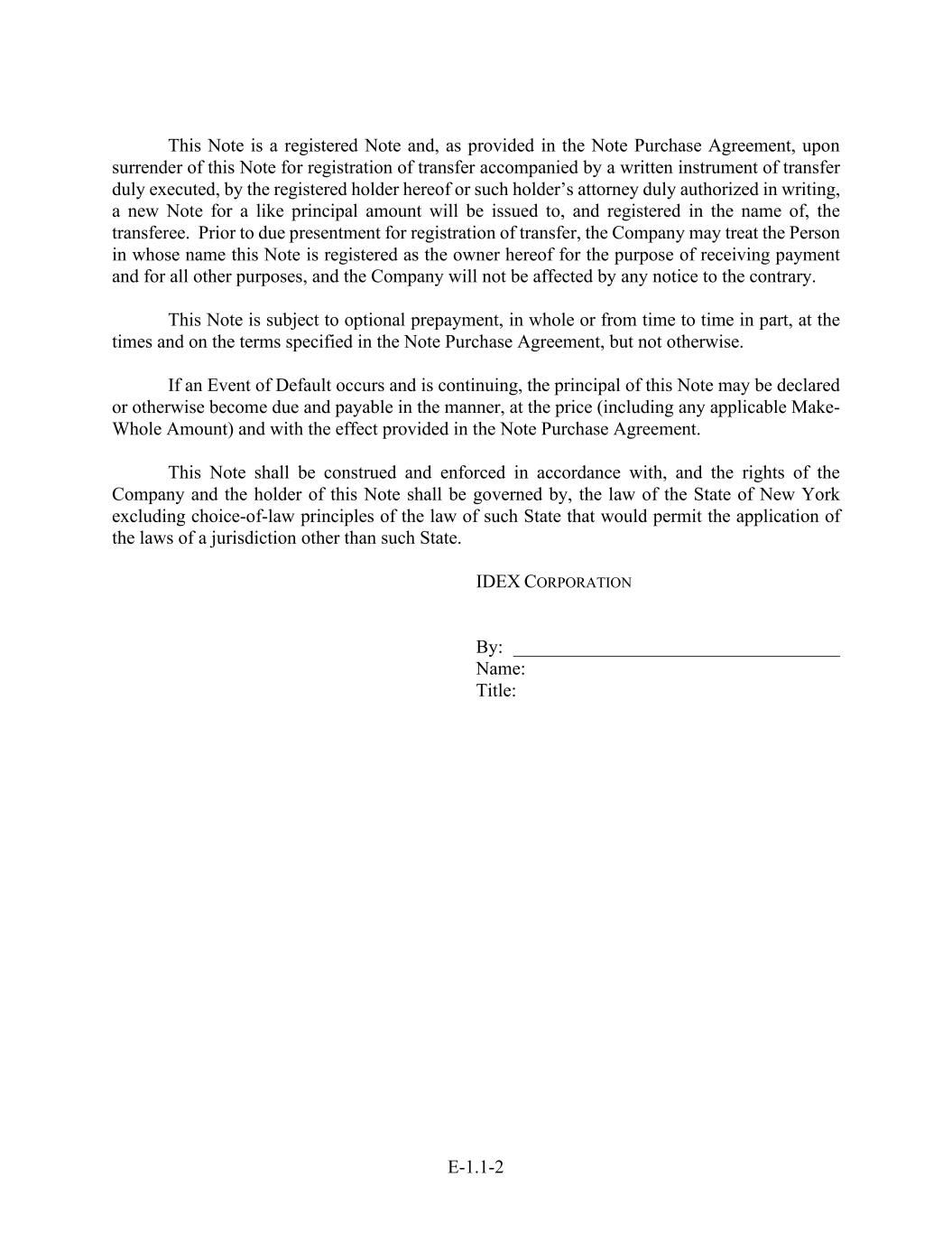 E-1.1-2 This Note is a registered Note and, as provided in the Note Purchase Agreement, upon surrender of this Note for registration of transfer accompanied by a written instrument of transfer duly executed, by the registered holder hereof or such holder’s attorney duly authorized in writing, a new Note for a like principal amount will be issued to, and registered in the name of, the transferee. Prior to due presentment for registration of transfer, the Company may treat the Person in whose name this Note is registered as the owner hereof for the purpose of receiving payment and for all other purposes, and the Company will not be affected by any notice to the contrary. This Note is subject to optional prepayment, in whole or from time to time in part, at the times and on the terms specified in the Note Purchase Agreement, but not otherwise. If an Event of Default occurs and is continuing, the principal of this Note may be declared or otherwise become due and payable in the manner, at the price (including any applicable Make- Whole Amount) and with the effect provided in the Note Purchase Agreement. This Note shall be construed and enforced in accordance with, and the rights of the Company and the holder of this Note shall be governed by, the law of the State of New York excluding choice-of-law principles of the law of such State that would permit the application of the laws of a jurisdiction other than such State. IDEX CORPORATION By: ___________________________________ Name: Title: