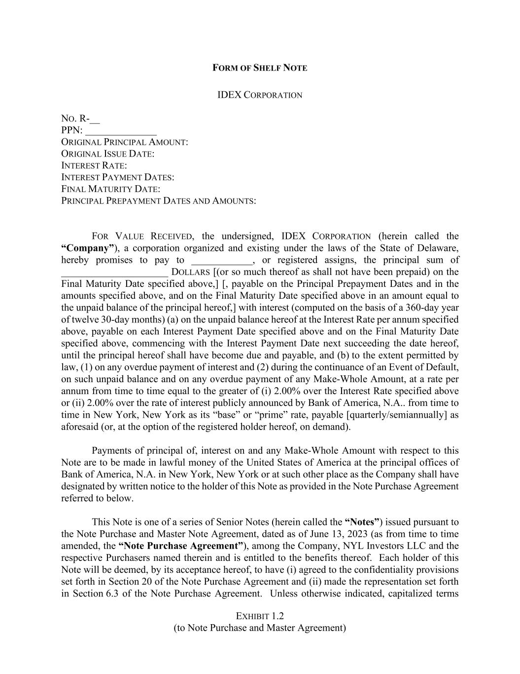 EXHIBIT 1.2 (to Note Purchase and Master Agreement) FORM OF SHELF NOTE IDEX CORPORATION NO. R-__ PPN: ______________ ORIGINAL PRINCIPAL AMOUNT: ORIGINAL ISSUE DATE: INTEREST RATE: INTEREST PAYMENT DATES: FINAL MATURITY DATE: PRINCIPAL PREPAYMENT DATES AND AMOUNTS: FOR VALUE RECEIVED, the undersigned, IDEX CORPORATION (herein called the “Company”), a corporation organized and existing under the laws of the State of Delaware, hereby promises to pay to ____________, or registered assigns, the principal sum of _____________________ DOLLARS [(or so much thereof as shall not have been prepaid) on the Final Maturity Date specified above,] [, payable on the Principal Prepayment Dates and in the amounts specified above, and on the Final Maturity Date specified above in an amount equal to the unpaid balance of the principal hereof,] with interest (computed on the basis of a 360-day year of twelve 30-day months) (a) on the unpaid balance hereof at the Interest Rate per annum specified above, payable on each Interest Payment Date specified above and on the Final Maturity Date specified above, commencing with the Interest Payment Date next succeeding the date hereof, until the principal hereof shall have become due and payable, and (b) to the extent permitted by law, (1) on any overdue payment of interest and (2) during the continuance of an Event of Default, on such unpaid balance and on any overdue payment of any Make-Whole Amount, at a rate per annum from time to time equal to the greater of (i) 2.00% over the Interest Rate specified above or (ii) 2.00% over the rate of interest publicly announced by Bank of America, N.A.. from time to time in New York, New York as its “base” or “prime” rate, payable [quarterly/semiannually] as aforesaid (or, at the option of the registered holder hereof, on demand). Payments of principal of, interest on and any Make-Whole Amount with respect to this Note are to be made in lawful money of the United States of America at the principal offices of Bank of America, N.A. in New York, New York or at such other place as the Company shall have designated by written notice to the holder of this Note as provided in the Note Purchase Agreement referred to below. This Note is one of a series of Senior Notes (herein called the “Notes”) issued pursuant to the Note Purchase and Master Note Agreement, dated as of June 13, 2023 (as from time to time amended, the “Note Purchase Agreement”), among the Company, NYL Investors LLC and the respective Purchasers named therein and is entitled to the benefits thereof. Each holder of this Note will be deemed, by its acceptance hereof, to have (i) agreed to the confidentiality provisions set forth in Section 20 of the Note Purchase Agreement and (ii) made the representation set forth in Section 6.3 of the Note Purchase Agreement. Unless otherwise indicated, capitalized terms