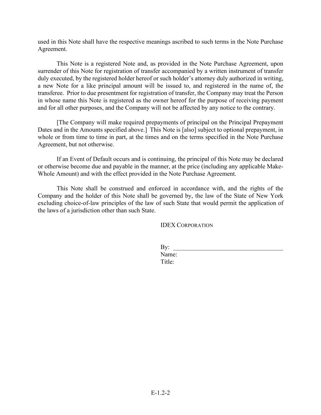 E-1.2-2 used in this Note shall have the respective meanings ascribed to such terms in the Note Purchase Agreement. This Note is a registered Note and, as provided in the Note Purchase Agreement, upon surrender of this Note for registration of transfer accompanied by a written instrument of transfer duly executed, by the registered holder hereof or such holder’s attorney duly authorized in writing, a new Note for a like principal amount will be issued to, and registered in the name of, the transferee. Prior to due presentment for registration of transfer, the Company may treat the Person in whose name this Note is registered as the owner hereof for the purpose of receiving payment and for all other purposes, and the Company will not be affected by any notice to the contrary. [The Company will make required prepayments of principal on the Principal Prepayment Dates and in the Amounts specified above.] This Note is [also] subject to optional prepayment, in whole or from time to time in part, at the times and on the terms specified in the Note Purchase Agreement, but not otherwise. If an Event of Default occurs and is continuing, the principal of this Note may be declared or otherwise become due and payable in the manner, at the price (including any applicable Make- Whole Amount) and with the effect provided in the Note Purchase Agreement. This Note shall be construed and enforced in accordance with, and the rights of the Company and the holder of this Note shall be governed by, the law of the State of New York excluding choice-of-law principles of the law of such State that would permit the application of the laws of a jurisdiction other than such State. IDEX CORPORATION By: ___________________________________ Name: Title: