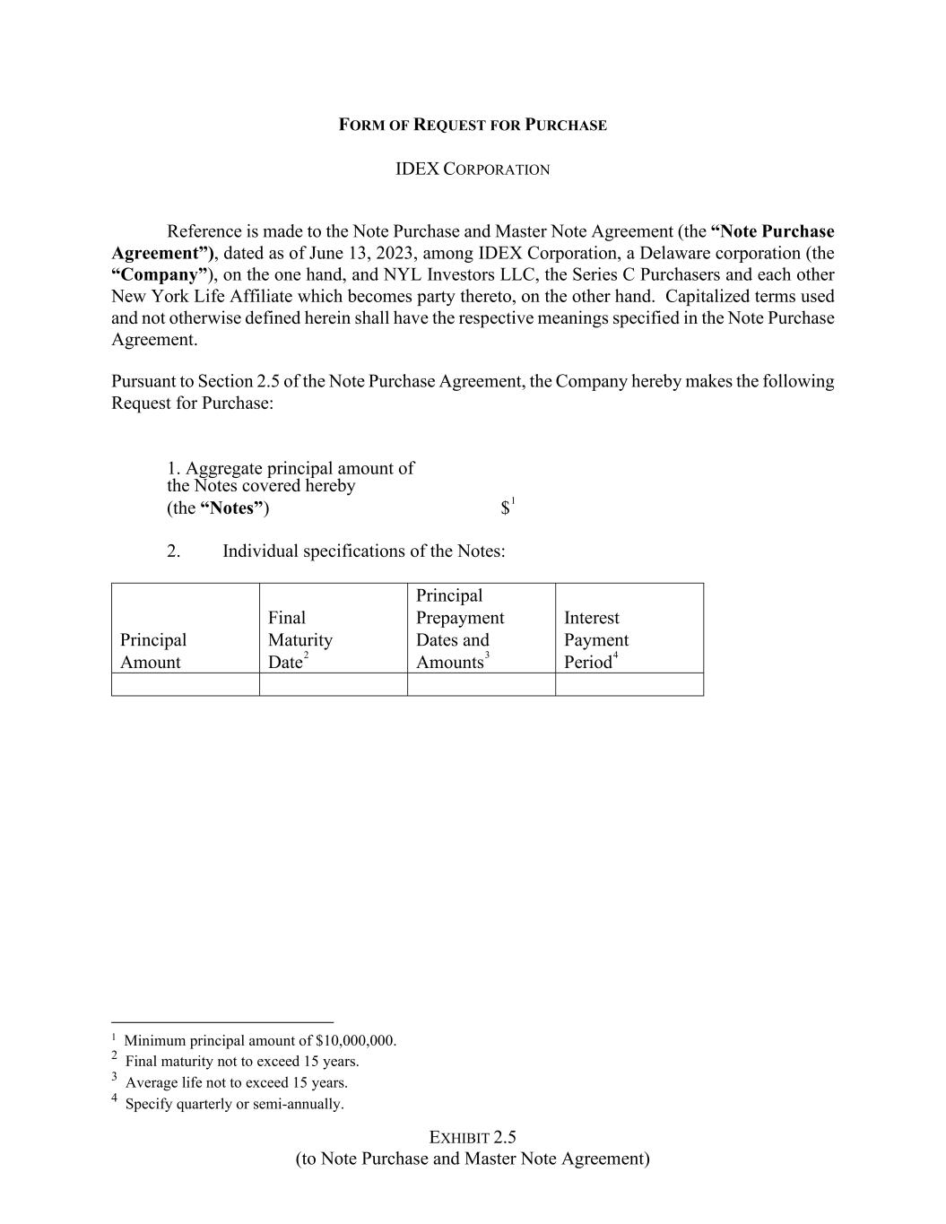 EXHIBIT 2.5 (to Note Purchase and Master Note Agreement) FORM OF REQUEST FOR PURCHASE IDEX CORPORATION Reference is made to the Note Purchase and Master Note Agreement (the “Note Purchase Agreement”), dated as of June 13, 2023, among IDEX Corporation, a Delaware corporation (the “Company”), on the one hand, and NYL Investors LLC, the Series C Purchasers and each other New York Life Affiliate which becomes party thereto, on the other hand. Capitalized terms used and not otherwise defined herein shall have the respective meanings specified in the Note Purchase Agreement. Pursuant to Section 2.5 of the Note Purchase Agreement, the Company hereby makes the following Request for Purchase: 1. Aggregate principal amount of the Notes covered hereby (the “Notes”) $1 2. Individual specifications of the Notes: Principal Amount Final Maturity Date2 Principal Prepayment Dates and Amounts3 Interest Payment Period4 1 Minimum principal amount of $10,000,000. 2 Final maturity not to exceed 15 years. 3 Average life not to exceed 15 years. 4 Specify quarterly or semi-annually.