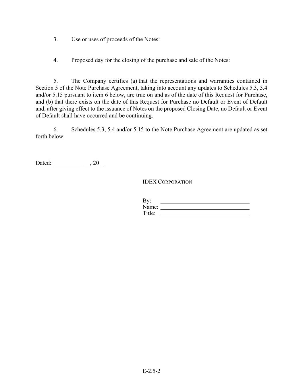E-2.5-2 3. Use or uses of proceeds of the Notes: 4. Proposed day for the closing of the purchase and sale of the Notes: 5. The Company certifies (a) that the representations and warranties contained in Section 5 of the Note Purchase Agreement, taking into account any updates to Schedules 5.3, 5.4 and/or 5.15 pursuant to item 6 below, are true on and as of the date of this Request for Purchase, and (b) that there exists on the date of this Request for Purchase no Default or Event of Default and, after giving effect to the issuance of Notes on the proposed Closing Date, no Default or Event of Default shall have occurred and be continuing. 6. Schedules 5.3, 5.4 and/or 5.15 to the Note Purchase Agreement are updated as set forth below: Dated: __________ __, 20__ IDEX CORPORATION By: Name: Title: