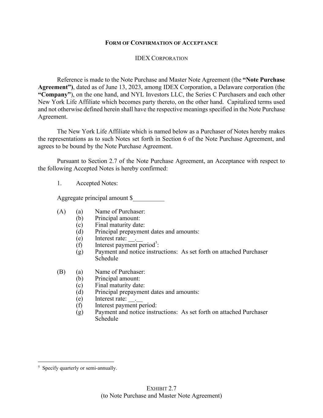 EXHIBIT 2.7 (to Note Purchase and Master Note Agreement) FORM OF CONFIRMATION OF ACCEPTANCE IDEX CORPORATION Reference is made to the Note Purchase and Master Note Agreement (the “Note Purchase Agreement”), dated as of June 13, 2023, among IDEX Corporation, a Delaware corporation (the “Company”), on the one hand, and NYL Investors LLC, the Series C Purchasers and each other New York Life Affiliate which becomes party thereto, on the other hand. Capitalized terms used and not otherwise defined herein shall have the respective meanings specified in the Note Purchase Agreement. The New York Life Affiliate which is named below as a Purchaser of Notes hereby makes the representations as to such Notes set forth in Section 6 of the Note Purchase Agreement, and agrees to be bound by the Note Purchase Agreement. Pursuant to Section 2.7 of the Note Purchase Agreement, an Acceptance with respect to the following Accepted Notes is hereby confirmed: 1. Accepted Notes: Aggregate principal amount $__________ (A) (a) Name of Purchaser: (b) Principal amount: (c) Final maturity date: (d) Principal prepayment dates and amounts: (e) Interest rate: __.__ (f) Interest payment period5: (g) Payment and notice instructions: As set forth on attached Purchaser Schedule (B) (a) Name of Purchaser: (b) Principal amount: (c) Final maturity date: (d) Principal prepayment dates and amounts: (e) Interest rate: __.__ (f) Interest payment period: (g) Payment and notice instructions: As set forth on attached Purchaser Schedule 5 Specify quarterly or semi-annually.