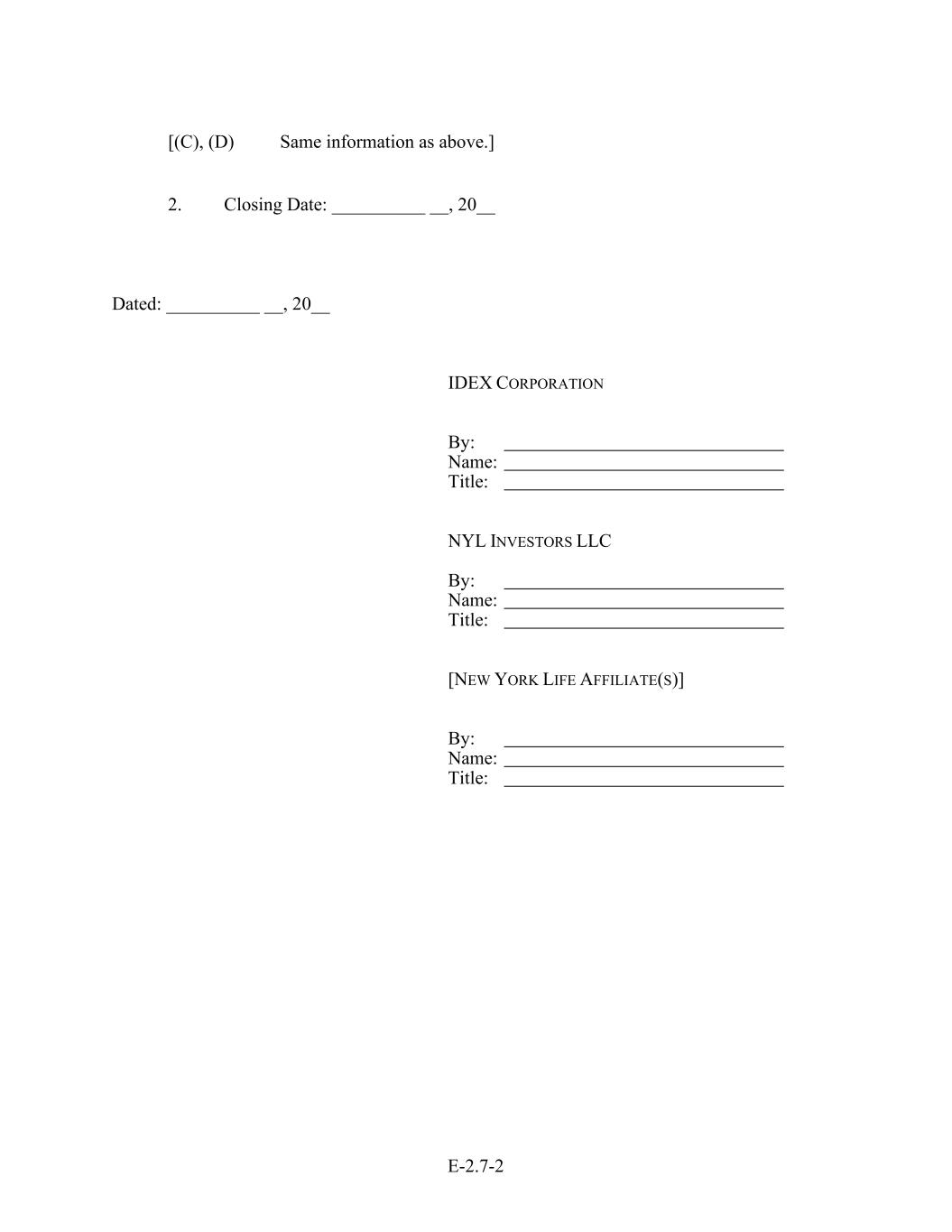 E-2.7-2 [(C), (D) Same information as above.] 2. Closing Date: __________ __, 20__ Dated: __________ __, 20__ IDEX CORPORATION By: Name: Title: NYL INVESTORS LLC By: Name: Title: [NEW YORK LIFE AFFILIATE(S)] By: Name: Title: