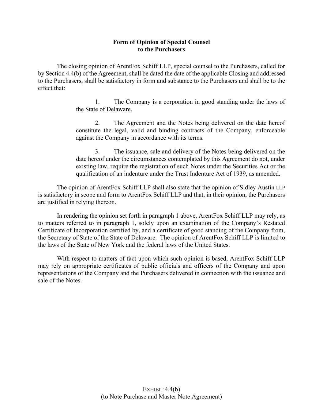 EXHIBIT 4.4(b) (to Note Purchase and Master Note Agreement) Form of Opinion of Special Counsel to the Purchasers The closing opinion of ArentFox Schiff LLP, special counsel to the Purchasers, called for by Section 4.4(b) of the Agreement, shall be dated the date of the applicable Closing and addressed to the Purchasers, shall be satisfactory in form and substance to the Purchasers and shall be to the effect that: 1. The Company is a corporation in good standing under the laws of the State of Delaware. 2. The Agreement and the Notes being delivered on the date hereof constitute the legal, valid and binding contracts of the Company, enforceable against the Company in accordance with its terms. 3. The issuance, sale and delivery of the Notes being delivered on the date hereof under the circumstances contemplated by this Agreement do not, under existing law, require the registration of such Notes under the Securities Act or the qualification of an indenture under the Trust Indenture Act of 1939, as amended. The opinion of ArentFox Schiff LLP shall also state that the opinion of Sidley Austin LLP is satisfactory in scope and form to ArentFox Schiff LLP and that, in their opinion, the Purchasers are justified in relying thereon. In rendering the opinion set forth in paragraph 1 above, ArentFox Schiff LLP may rely, as to matters referred to in paragraph 1, solely upon an examination of the Company’s Restated Certificate of Incorporation certified by, and a certificate of good standing of the Company from, the Secretary of State of the State of Delaware. The opinion of ArentFox Schiff LLP is limited to the laws of the State of New York and the federal laws of the United States. With respect to matters of fact upon which such opinion is based, ArentFox Schiff LLP may rely on appropriate certificates of public officials and officers of the Company and upon representations of the Company and the Purchasers delivered in connection with the issuance and sale of the Notes.