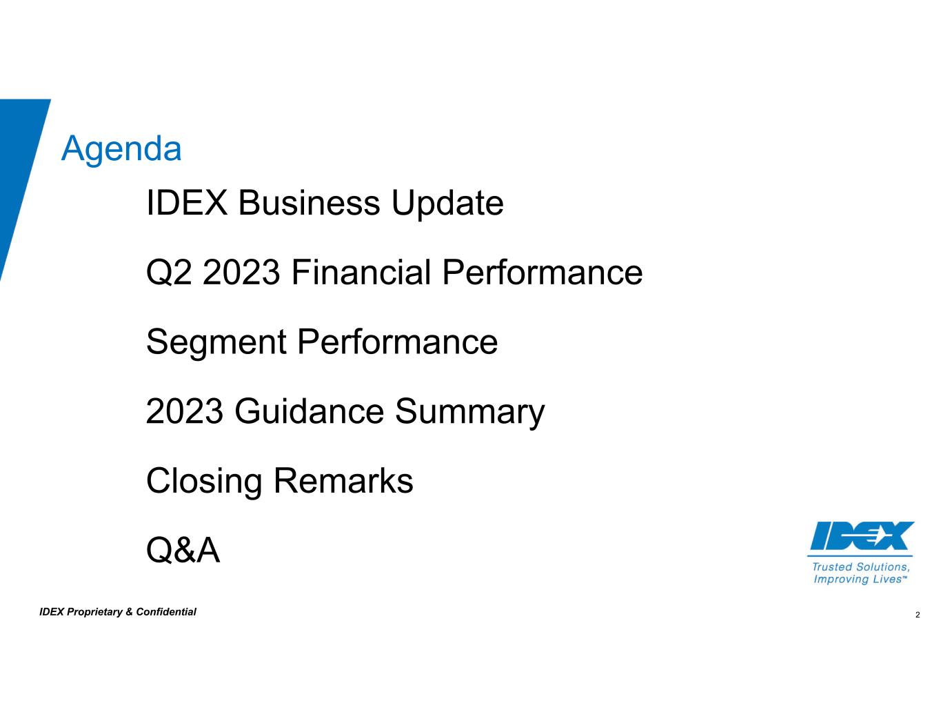 2IDEX Proprietary & Confidential Agenda IDEX Business Update Q2 2023 Financial Performance Segment Performance 2023 Guidance Summary Closing Remarks Q&A