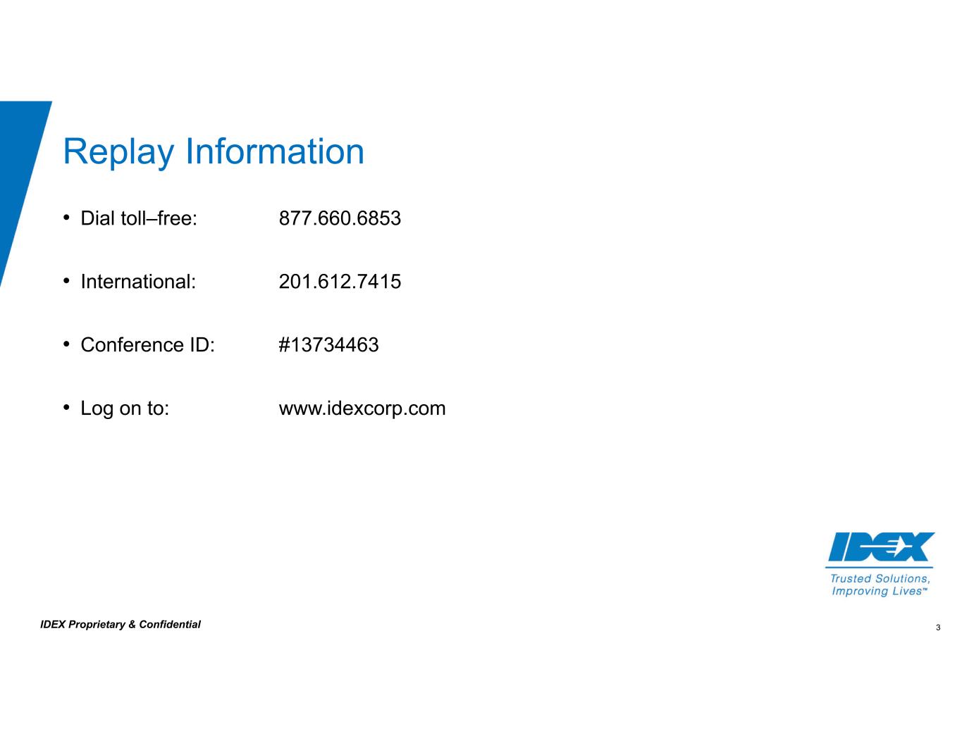 3IDEX Proprietary & Confidential Replay Information • Dial toll–free: 877.660.6853 • International: 201.612.7415 • Conference ID: #13734463 • Log on to: www.idexcorp.com