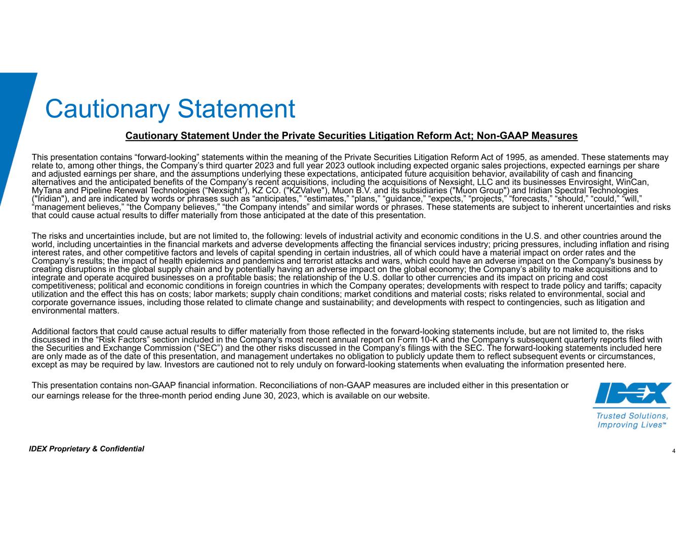 4IDEX Proprietary & Confidential Cautionary Statement Cautionary Statement Under the Private Securities Litigation Reform Act; Non-GAAP Measures This presentation contains “forward-looking” statements within the meaning of the Private Securities Litigation Reform Act of 1995, as amended. These statements may relate to, among other things, the Company’s third quarter 2023 and full year 2023 outlook including expected organic sales projections, expected earnings per share and adjusted earnings per share, and the assumptions underlying these expectations, anticipated future acquisition behavior, availability of cash and financing alternatives and the anticipated benefits of the Company’s recent acquisitions, including the acquisitions of Nexsight, LLC and its businesses Envirosight, WinCan, MyTana and Pipeline Renewal Technologies (“Nexsight”), KZ CO. ("KZValve"), Muon B.V. and its subsidiaries ("Muon Group") and Iridian Spectral Technologies ("Iridian"), and are indicated by words or phrases such as “anticipates,” “estimates,” “plans,” “guidance,” “expects,” “projects,” “forecasts,” “should,” “could,” “will,” “management believes,” “the Company believes,” “the Company intends” and similar words or phrases. These statements are subject to inherent uncertainties and risks that could cause actual results to differ materially from those anticipated at the date of this presentation. The risks and uncertainties include, but are not limited to, the following: levels of industrial activity and economic conditions in the U.S. and other countries around the world, including uncertainties in the financial markets and adverse developments affecting the financial services industry; pricing pressures, including inflation and rising interest rates, and other competitive factors and levels of capital spending in certain industries, all of which could have a material impact on order rates and the Company’s results; the impact of health epidemics and pandemics and terrorist attacks and wars, which could have an adverse impact on the Company's business by creating disruptions in the global supply chain and by potentially having an adverse impact on the global economy; the Company’s ability to make acquisitions and to integrate and operate acquired businesses on a profitable basis; the relationship of the U.S. dollar to other currencies and its impact on pricing and cost competitiveness; political and economic conditions in foreign countries in which the Company operates; developments with respect to trade policy and tariffs; capacity utilization and the effect this has on costs; labor markets; supply chain conditions; market conditions and material costs; risks related to environmental, social and corporate governance issues, including those related to climate change and sustainability; and developments with respect to contingencies, such as litigation and environmental matters. Additional factors that could cause actual results to differ materially from those reflected in the forward-looking statements include, but are not limited to, the risks discussed in the “Risk Factors” section included in the Company’s most recent annual report on Form 10-K and the Company’s subsequent quarterly reports filed with the Securities and Exchange Commission (“SEC”) and the other risks discussed in the Company’s filings with the SEC. The forward-looking statements included here are only made as of the date of this presentation, and management undertakes no obligation to publicly update them to reflect subsequent events or circumstances, except as may be required by law. Investors are cautioned not to rely unduly on forward-looking statements when evaluating the information presented here. This presentation contains non-GAAP financial information. Reconciliations of non-GAAP measures are included either in this presentation or our earnings release for the three-month period ending June 30, 2023, which is available on our website.