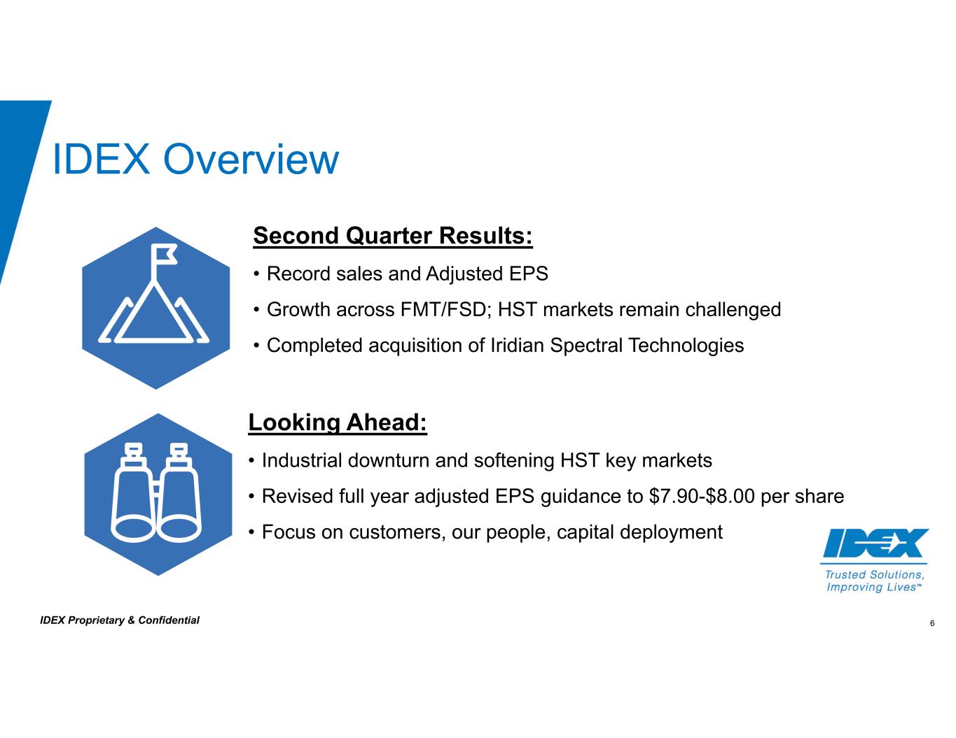 6IDEX Proprietary & Confidential IDEX Overview Second Quarter Results: • Record sales and Adjusted EPS • Growth across FMT/FSD; HST markets remain challenged • Completed acquisition of Iridian Spectral Technologies Looking Ahead: • Industrial downturn and softening HST key markets • Revised full year adjusted EPS guidance to $7.90-$8.00 per share • Focus on customers, our people, capital deployment