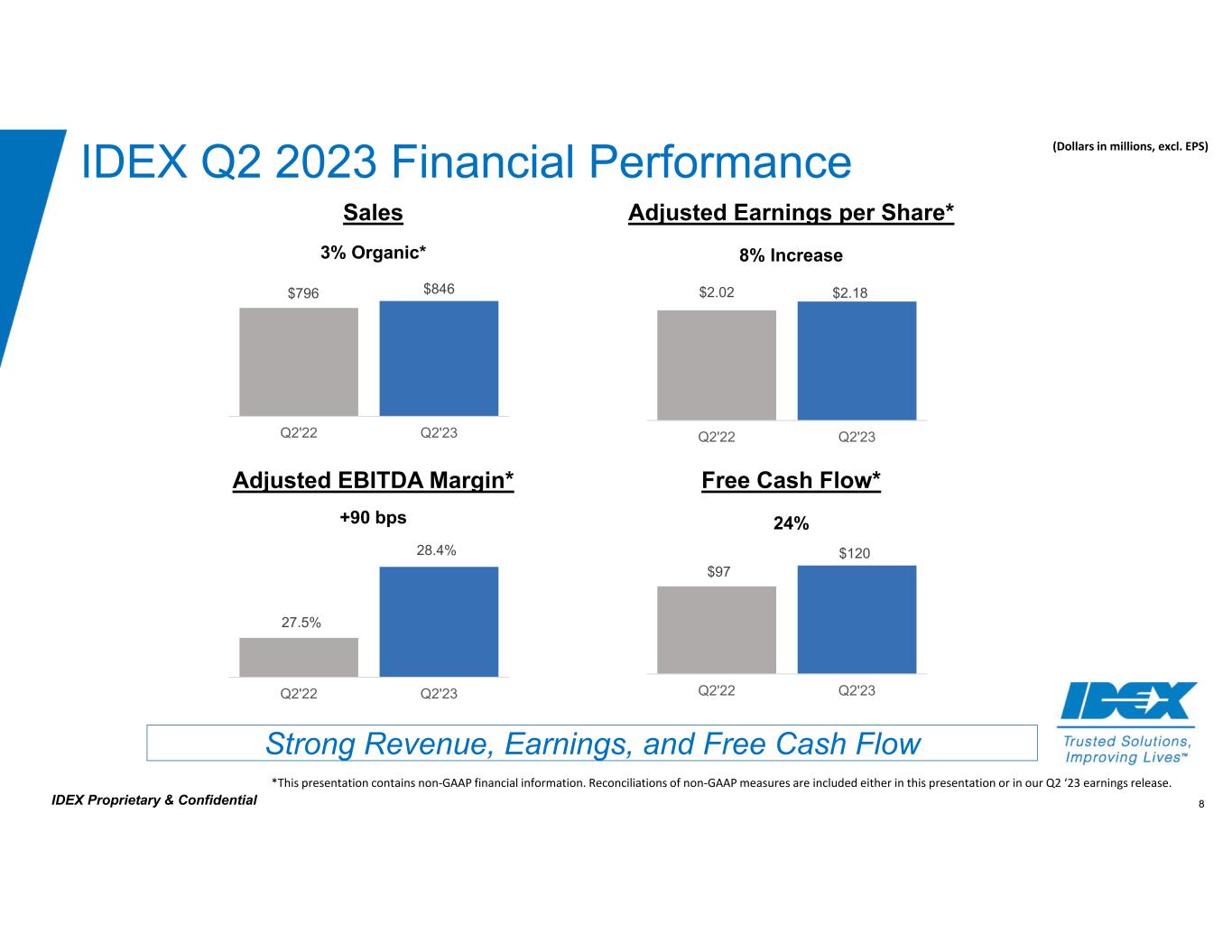 4IDEX Proprietary & Confidential Cautionary Statement Cautionary Statement Under the Private Securities Litigation Reform Act; Non-GAAP Measures This presentation contains “forward-looking” statements within the meaning of the Private Securities Litigation Reform Act of 1995, as amended. These statements may relate to, among other things, the Company’s third quarter 2023 and full year 2023 outlook including expected organic sales projections, expected earnings per share and adjusted earnings per share, and the assumptions underlying these expectations, anticipated future acquisition behavior, availability of cash and financing alternatives and the anticipated benefits of the Company’s recent acquisitions, including the acquisitions of Nexsight, LLC and its businesses Envirosight, WinCan, MyTana and Pipeline Renewal Technologies (“Nexsight”), KZ CO. ("KZValve"), Muon B.V. and its subsidiaries ("Muon Group") and Iridian Spectral Technologies ("Iridian"), and are indicated by words or phrases such as “anticipates,” “estimates,” “plans,” “guidance,” “expects,” “projects,” “forecasts,” “should,” “could,” “will,” “management believes,” “the Company believes,” “the Company intends” and similar words or phrases. These statements are subject to inherent uncertainties and risks that could cause actual results to differ materially from those anticipated at the date of this presentation. The risks and uncertainties include, but are not limited to, the following: levels of industrial activity and economic conditions in the U.S. and other countries around the world, including uncertainties in the financial markets and adverse developments affecting the financial services industry; pricing pressures, including inflation and rising interest rates, and other competitive factors and levels of capital spending in certain industries, all of which could have a material impact on order rates and the Company’s results; the impact of health epidemics and pandemics and terrorist attacks and wars, which could have an adverse impact on the Company's business by creating disruptions in the global supply chain and by potentially having an adverse impact on the global economy; the Company’s ability to make acquisitions and to integrate and operate acquired businesses on a profitable basis; the relationship of the U.S. dollar to other currencies and its impact on pricing and cost competitiveness; political and economic conditions in foreign countries in which the Company operates; developments with respect to trade policy and tariffs; capacity utilization and the effect this has on costs; labor markets; supply chain conditions; market conditions and material costs; risks related to environmental, social and corporate governance issues, including those related to climate change and sustainability; and developments with respect to contingencies, such as litigation and environmental matters. Additional factors that could cause actual results to differ materially from those reflected in the forward-looking statements include, but are not limited to, the risks discussed in the “Risk Factors” section included in the Company’s most recent annual report on Form 10-K and the Company’s subsequent quarterly reports filed with the Securities and Exchange Commission (“SEC”) and the other risks discussed in the Company’s filings with the SEC. The forward-looking statements included here are only made as of the date of this presentation, and management undertakes no obligation to publicly update them to reflect subsequent events or circumstances, except as may be required by law. Investors are cautioned not to rely unduly on forward-looking statements when evaluating the information presented here. This presentation contains non-GAAP financial information. Reconciliations of non-GAAP measures are included either in this presentation or our earnings release for the three-month period ending June 30, 2023, which is available on our website.