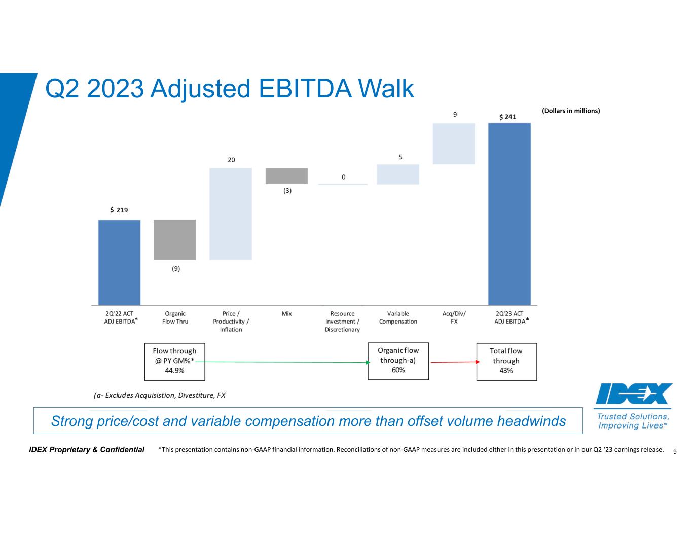 8IDEX Proprietary & Confidential $97 $120 Q2'22 Q2'23 IDEX Q2 2023 Financial Performance Strong Revenue, Earnings, and Free Cash Flow (Dollars in millions, excl. EPS) *This presentation contains non‐GAAP financial information. Reconciliations of non‐GAAP measures are included either in this presentation or in our Q2 ‘23 earnings release. Sales Adjusted Earnings per Share* Adjusted EBITDA Margin* Free Cash Flow* 3% Organic* 8% Increase +90 bps 24% $796 $846 Q2'22 Q2'23 $2.02 $2.18 Q2'22 Q2'23 27.5% 28.4% Q2'22 Q2'23