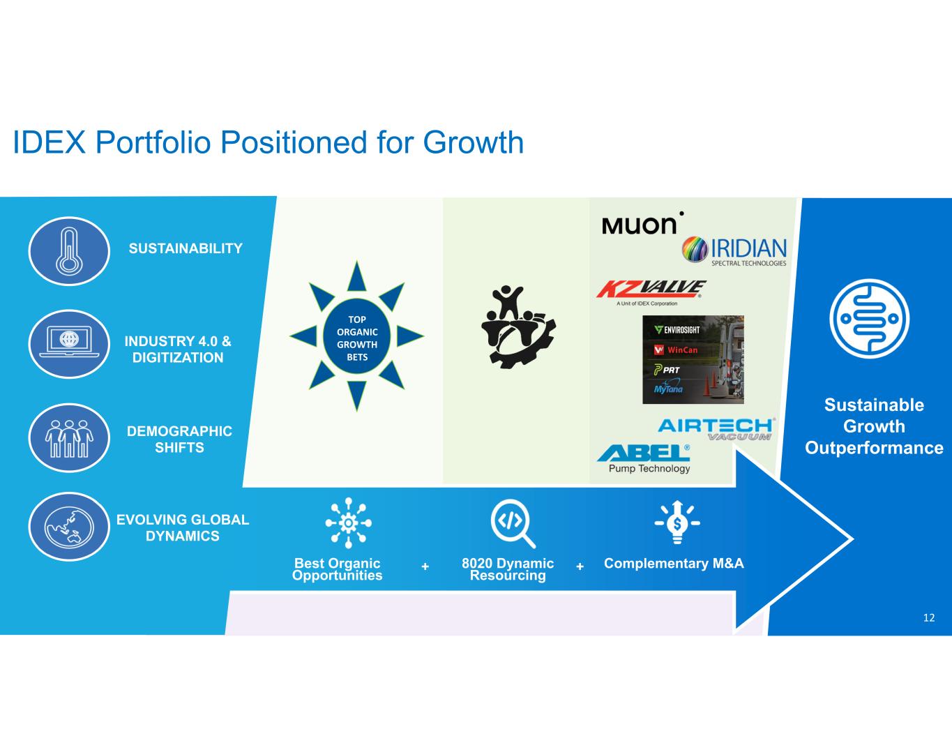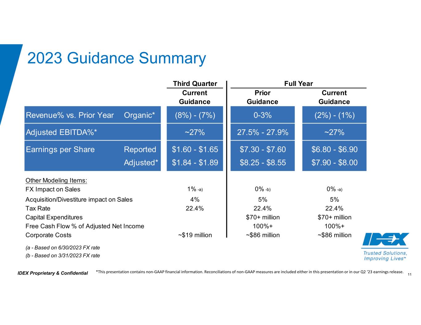 11IDEX Proprietary & Confidential Third Quarter Full Year Current Guidance Prior Guidance Current Guidance Revenue% vs. Prior Year Organic* (8%) - (7%) 0-3% (2%) - (1%) Adjusted EBITDA%* ~27% 27.5% - 27.9% ~27% Earnings per Share Reported $1.60 - $1.65 $7.30 - $7.60 $6.80 - $6.90 Adjusted* $1.84 - $1.89 $8.25 - $8.55 $7.90 - $8.00 Other Modeling Items: FX Impact on Sales 1% -a) 0% -b) 0% -a) Acquisition/Divestiture impact on Sales 4% 5% 5% Tax Rate 22.4% 22.4% 22.4% Capital Expenditures $70+ million $70+ million Free Cash Flow % of Adjusted Net Income 100%+ 100%+ Corporate Costs ~$19 million ~$86 million ~$86 million (a - Based on 6/30/2023 FX rate (b - Based on 3/31/2023 FX rate 2023 Guidance Summary *This presentation contains non‐GAAP financial information. Reconciliations of non‐GAAP measures are included either in this presentation or in our Q2 ‘23 earnings release.