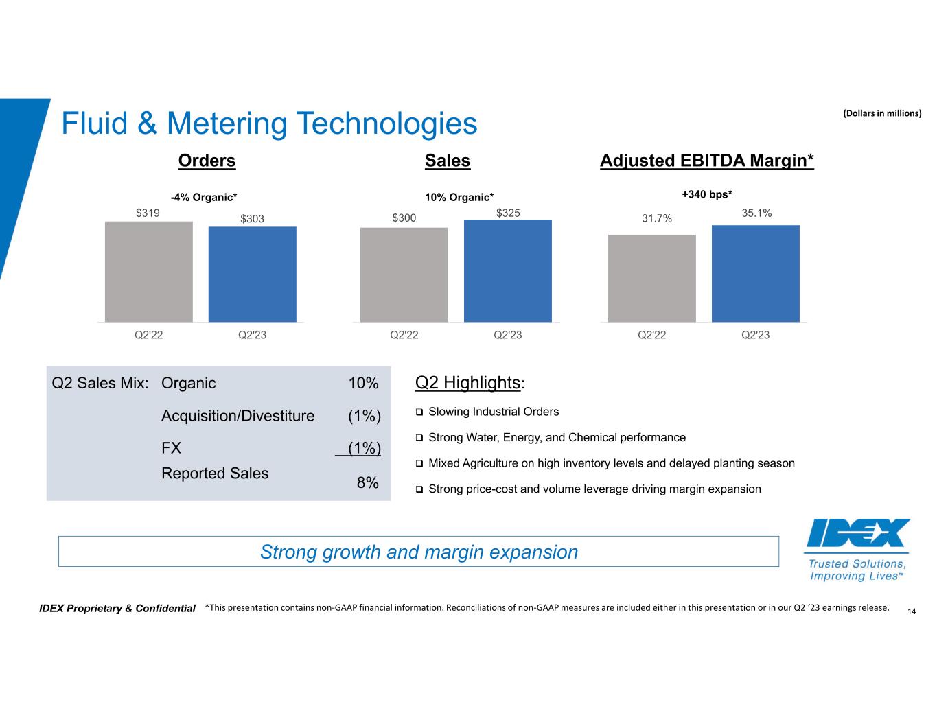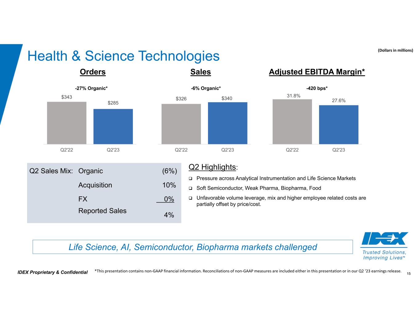 14IDEX Proprietary & Confidential Fluid & Metering Technologies Q2 Highlights:  Slowing Industrial Orders  Strong Water, Energy, and Chemical performance  Mixed Agriculture on high inventory levels and delayed planting season  Strong price-cost and volume leverage driving margin expansion Strong growth and margin expansion (Dollars in millions) Q2 Sales Mix: Organic 10% Acquisition/Divestiture (1%) FX (1%) Reported Sales 8% *This presentation contains non‐GAAP financial information. Reconciliations of non‐GAAP measures are included either in this presentation or in our Q2 ‘23 earnings release. 31.7% 35.1% Q2'22 Q2'23 Orders Sales Adjusted EBITDA Margin* $319 $303 Q2'22 Q2'23 +340 bps* $300 $325 Q2'22 Q2'23 -4% Organic* 10% Organic*
