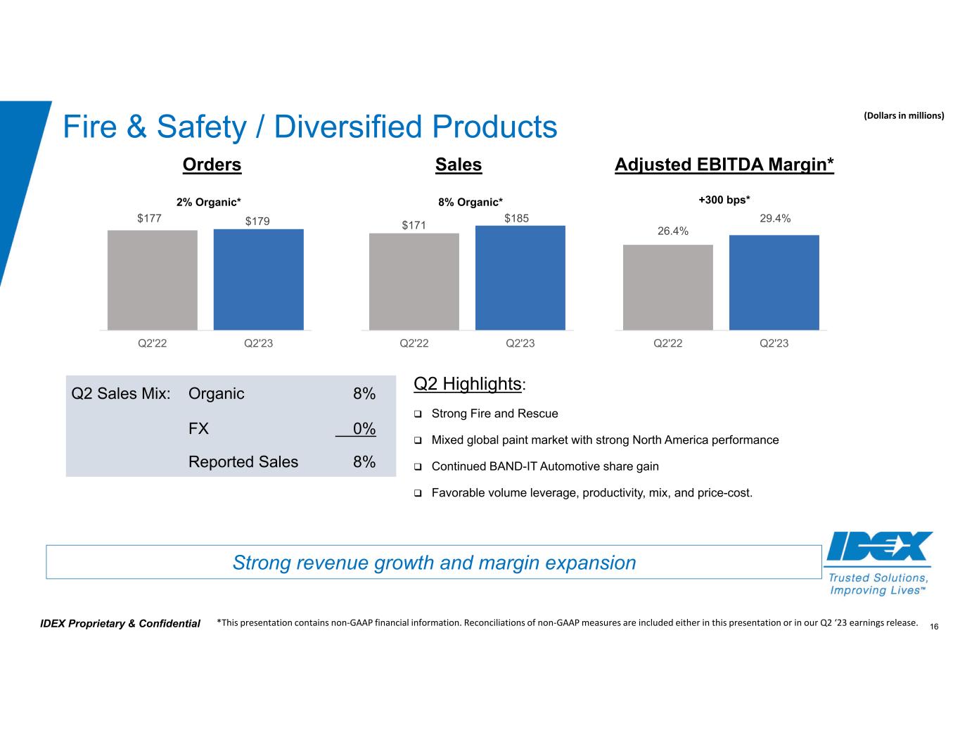 15IDEX Proprietary & Confidential Health & Science Technologies Q2 Sales Mix: Organic (6%) Acquisition 10% FX 0% Reported Sales 4% Q2 Highlights:  Pressure across Analytical Instrumentation and Life Science Markets  Soft Semiconductor, Weak Pharma, Biopharma, Food  Unfavorable volume leverage, mix and higher employee related costs are partially offset by price/cost. Life Science, AI, Semiconductor, Biopharma markets challenged (Dollars in millions) *This presentation contains non‐GAAP financial information. Reconciliations of non‐GAAP measures are included either in this presentation or in our Q2 ‘23 earnings release. 31.8% 27.6% Q2'22 Q2'23 Orders Sales Adjusted EBITDA Margin* $343 $285 Q2'22 Q2'23 -420 bps* $326 $340 Q2'22 Q2'23 -27% Organic* -6% Organic*