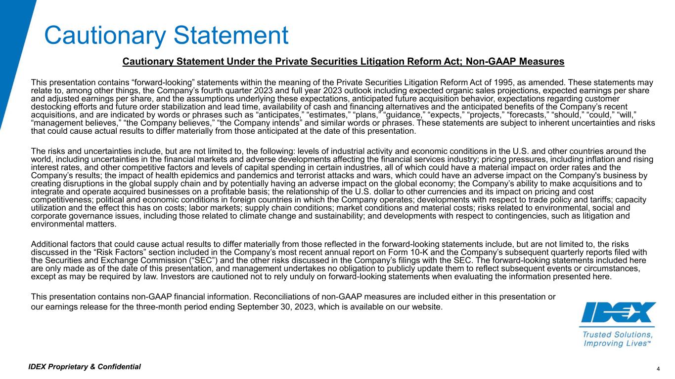4IDEX Proprietary & Confidential Cautionary Statement Cautionary Statement Under the Private Securities Litigation Reform Act; Non-GAAP Measures This presentation contains “forward-looking” statements within the meaning of the Private Securities Litigation Reform Act of 1995, as amended. These statements may relate to, among other things, the Company’s fourth quarter 2023 and full year 2023 outlook including expected organic sales projections, expected earnings per share and adjusted earnings per share, and the assumptions underlying these expectations, anticipated future acquisition behavior, expectations regarding customer destocking efforts and future order stabilization and lead time, availability of cash and financing alternatives and the anticipated benefits of the Company’s recent acquisitions, and are indicated by words or phrases such as “anticipates,” “estimates,” “plans,” “guidance,” “expects,” “projects,” “forecasts,” “should,” “could,” “will,” “management believes,” “the Company believes,” “the Company intends” and similar words or phrases. These statements are subject to inherent uncertainties and risks that could cause actual results to differ materially from those anticipated at the date of this presentation. The risks and uncertainties include, but are not limited to, the following: levels of industrial activity and economic conditions in the U.S. and other countries around the world, including uncertainties in the financial markets and adverse developments affecting the financial services industry; pricing pressures, including inflation and rising interest rates, and other competitive factors and levels of capital spending in certain industries, all of which could have a material impact on order rates and the Company’s results; the impact of health epidemics and pandemics and terrorist attacks and wars, which could have an adverse impact on the Company's business by creating disruptions in the global supply chain and by potentially having an adverse impact on the global economy; the Company’s ability to make acquisitions and to integrate and operate acquired businesses on a profitable basis; the relationship of the U.S. dollar to other currencies and its impact on pricing and cost competitiveness; political and economic conditions in foreign countries in which the Company operates; developments with respect to trade policy and tariffs; capacity utilization and the effect this has on costs; labor markets; supply chain conditions; market conditions and material costs; risks related to environmental, social and corporate governance issues, including those related to climate change and sustainability; and developments with respect to contingencies, such as litigation and environmental matters. Additional factors that could cause actual results to differ materially from those reflected in the forward-looking statements include, but are not limited to, the risks discussed in the “Risk Factors” section included in the Company’s most recent annual report on Form 10-K and the Company’s subsequent quarterly reports filed with the Securities and Exchange Commission (“SEC”) and the other risks discussed in the Company’s filings with the SEC. The forward-looking statements included here are only made as of the date of this presentation, and management undertakes no obligation to publicly update them to reflect subsequent events or circumstances, except as may be required by law. Investors are cautioned not to rely unduly on forward-looking statements when evaluating the information presented here. This presentation contains non-GAAP financial information. Reconciliations of non-GAAP measures are included either in this presentation or our earnings release for the three-month period ending September 30, 2023, which is available on our website.