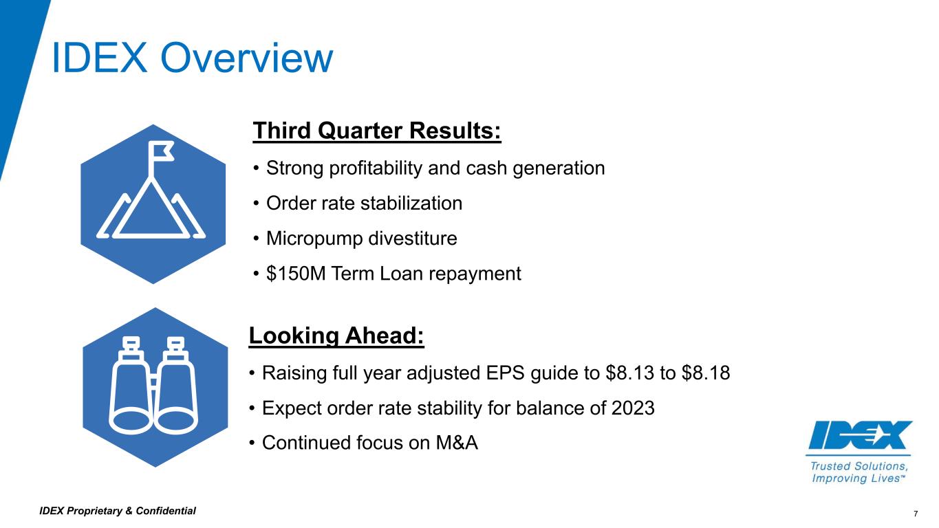 4IDEX Proprietary & Confidential Cautionary Statement Cautionary Statement Under the Private Securities Litigation Reform Act; Non-GAAP Measures This presentation contains “forward-looking” statements within the meaning of the Private Securities Litigation Reform Act of 1995, as amended. These statements may relate to, among other things, the Company’s fourth quarter 2023 and full year 2023 outlook including expected organic sales projections, expected earnings per share and adjusted earnings per share, and the assumptions underlying these expectations, anticipated future acquisition behavior, expectations regarding customer destocking efforts and future order stabilization and lead time, availability of cash and financing alternatives and the anticipated benefits of the Company’s recent acquisitions, and are indicated by words or phrases such as “anticipates,” “estimates,” “plans,” “guidance,” “expects,” “projects,” “forecasts,” “should,” “could,” “will,” “management believes,” “the Company believes,” “the Company intends” and similar words or phrases. These statements are subject to inherent uncertainties and risks that could cause actual results to differ materially from those anticipated at the date of this presentation. The risks and uncertainties include, but are not limited to, the following: levels of industrial activity and economic conditions in the U.S. and other countries around the world, including uncertainties in the financial markets and adverse developments affecting the financial services industry; pricing pressures, including inflation and rising interest rates, and other competitive factors and levels of capital spending in certain industries, all of which could have a material impact on order rates and the Company’s results; the impact of health epidemics and pandemics and terrorist attacks and wars, which could have an adverse impact on the Company's business by creating disruptions in the global supply chain and by potentially having an adverse impact on the global economy; the Company’s ability to make acquisitions and to integrate and operate acquired businesses on a profitable basis; the relationship of the U.S. dollar to other currencies and its impact on pricing and cost competitiveness; political and economic conditions in foreign countries in which the Company operates; developments with respect to trade policy and tariffs; capacity utilization and the effect this has on costs; labor markets; supply chain conditions; market conditions and material costs; risks related to environmental, social and corporate governance issues, including those related to climate change and sustainability; and developments with respect to contingencies, such as litigation and environmental matters. Additional factors that could cause actual results to differ materially from those reflected in the forward-looking statements include, but are not limited to, the risks discussed in the “Risk Factors” section included in the Company’s most recent annual report on Form 10-K and the Company’s subsequent quarterly reports filed with the Securities and Exchange Commission (“SEC”) and the other risks discussed in the Company’s filings with the SEC. The forward-looking statements included here are only made as of the date of this presentation, and management undertakes no obligation to publicly update them to reflect subsequent events or circumstances, except as may be required by law. Investors are cautioned not to rely unduly on forward-looking statements when evaluating the information presented here. This presentation contains non-GAAP financial information. Reconciliations of non-GAAP measures are included either in this presentation or our earnings release for the three-month period ending September 30, 2023, which is available on our website.