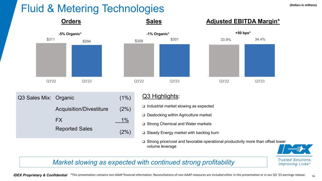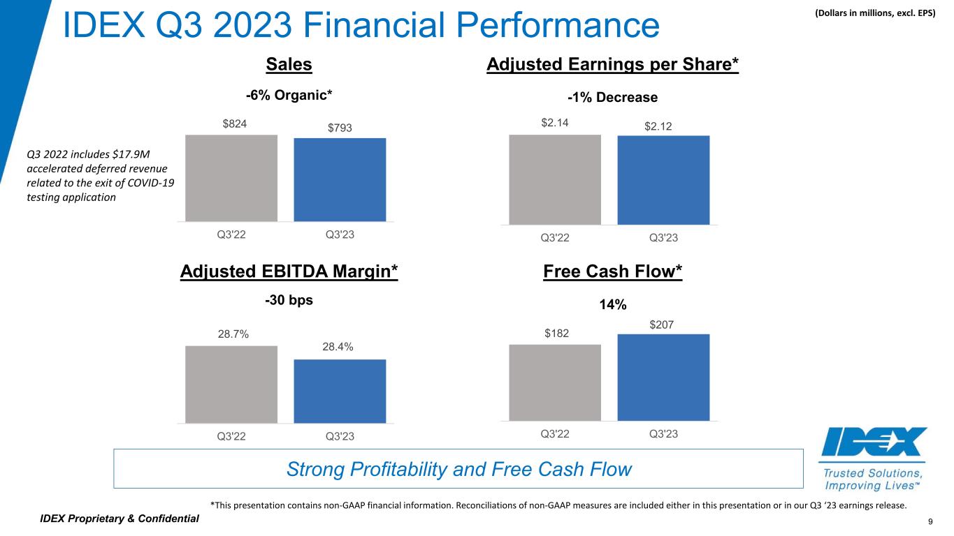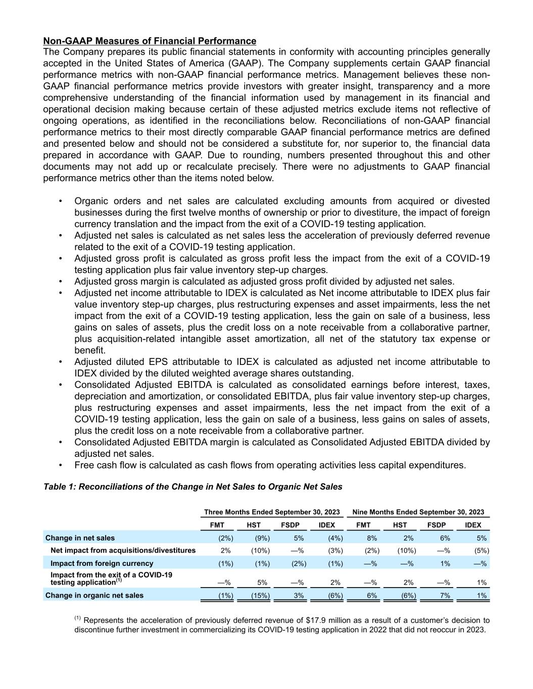 Non-GAAP Measures of Financial Performance The Company prepares its public financial statements in conformity with accounting principles generally accepted in the United States of America (GAAP). The Company supplements certain GAAP financial performance metrics with non-GAAP financial performance metrics. Management believes these non- GAAP financial performance metrics provide investors with greater insight, transparency and a more comprehensive understanding of the financial information used by management in its financial and operational decision making because certain of these adjusted metrics exclude items not reflective of ongoing operations, as identified in the reconciliations below. Reconciliations of non-GAAP financial performance metrics to their most directly comparable GAAP financial performance metrics are defined and presented below and should not be considered a substitute for, nor superior to, the financial data prepared in accordance with GAAP. Due to rounding, numbers presented throughout this and other documents may not add up or recalculate precisely. There were no adjustments to GAAP financial performance metrics other than the items noted below. • Organic orders and net sales are calculated excluding amounts from acquired or divested businesses during the first twelve months of ownership or prior to divestiture, the impact of foreign currency translation and the impact from the exit of a COVID-19 testing application. • Adjusted net sales is calculated as net sales less the acceleration of previously deferred revenue related to the exit of a COVID-19 testing application. • Adjusted gross profit is calculated as gross profit less the impact from the exit of a COVID-19 testing application plus fair value inventory step-up charges. • Adjusted gross margin is calculated as adjusted gross profit divided by adjusted net sales. • Adjusted net income attributable to IDEX is calculated as Net income attributable to IDEX plus fair value inventory step-up charges, plus restructuring expenses and asset impairments, less the net impact from the exit of a COVID-19 testing application, less the gain on sale of a business, less gains on sales of assets, plus the credit loss on a note receivable from a collaborative partner, plus acquisition-related intangible asset amortization, all net of the statutory tax expense or benefit. • Adjusted diluted EPS attributable to IDEX is calculated as adjusted net income attributable to IDEX divided by the diluted weighted average shares outstanding. • Consolidated Adjusted EBITDA is calculated as consolidated earnings before interest, taxes, depreciation and amortization, or consolidated EBITDA, plus fair value inventory step-up charges, plus restructuring expenses and asset impairments, less the net impact from the exit of a COVID-19 testing application, less the gain on sale of a business, less gains on sales of assets, plus the credit loss on a note receivable from a collaborative partner. • Consolidated Adjusted EBITDA margin is calculated as Consolidated Adjusted EBITDA divided by adjusted net sales. • Free cash flow is calculated as cash flows from operating activities less capital expenditures. Table 1: Reconciliations of the Change in Net Sales to Organic Net Sales Three Months Ended September 30, 2023 Nine Months Ended September 30, 2023 FMT HST FSDP IDEX FMT HST FSDP IDEX Change in net sales (2%) (9%) 5% (4%) 8% 2% 6% 5% Net impact from acquisitions/divestitures 2% (10%) —% (3%) (2%) (10%) —% (5%) Impact from foreign currency (1%) (1%) (2%) (1%) —% —% 1% —% Impact from the exit of a COVID-19 testing application(1) —% 5% —% 2% —% 2% —% 1% Change in organic net sales (1%) (15%) 3% (6%) 6% (6%) 7% 1% (1) Represents the acceleration of previously deferred revenue of $17.9 million as a result of a customer’s decision to discontinue further investment in commercializing its COVID-19 testing application in 2022 that did not reoccur in 2023.