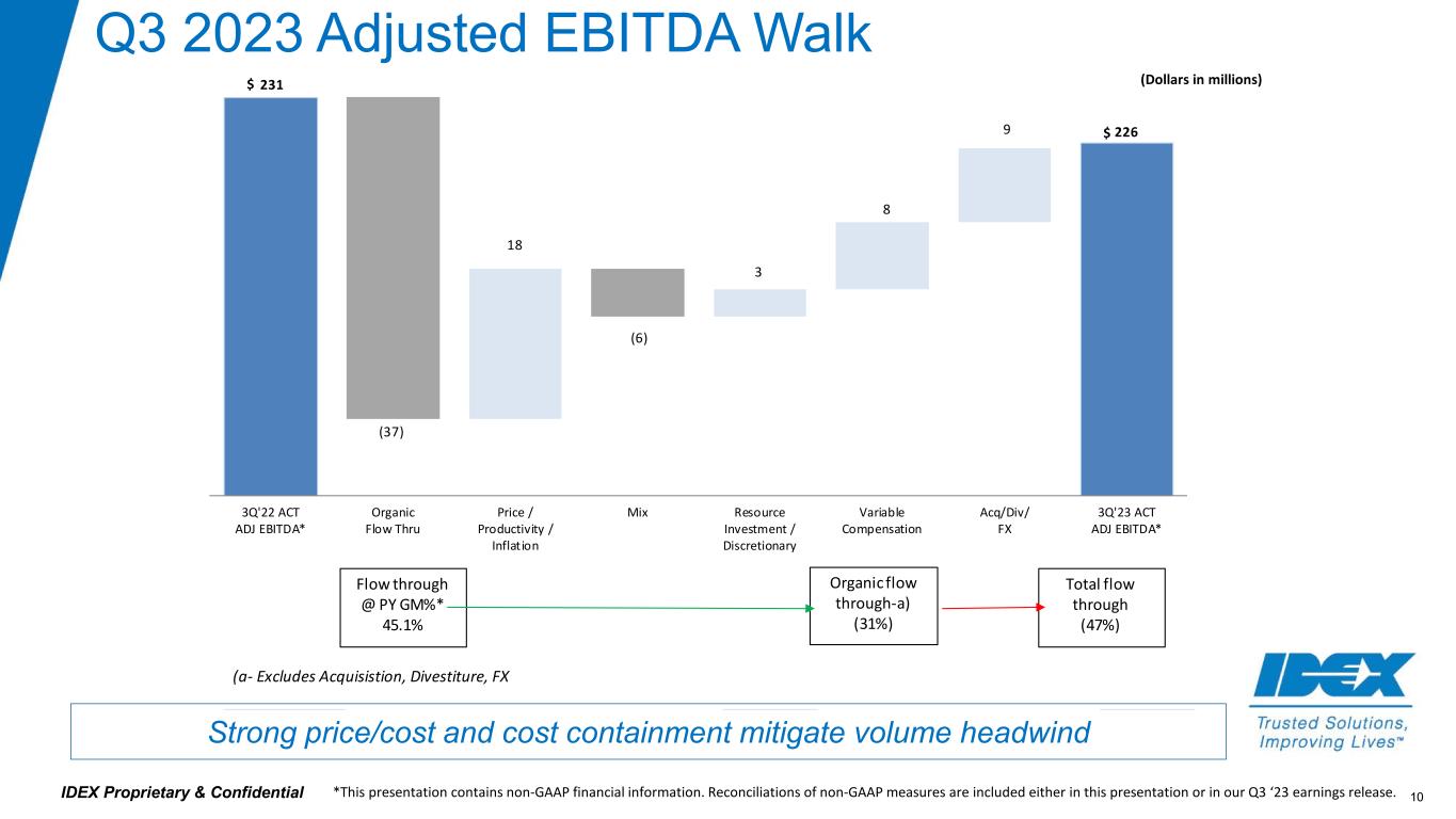 9IDEX Proprietary & Confidential $182 $207 Q3'22 Q3'23 IDEX Q3 2023 Financial Performance Strong Profitability and Free Cash Flow (Dollars in millions, excl. EPS) *This presentation contains non-GAAP financial information. Reconciliations of non-GAAP measures are included either in this presentation or in our Q3 ‘23 earnings release. Sales Adjusted Earnings per Share* Adjusted EBITDA Margin* Free Cash Flow* -6% Organic* -1% Decrease -30 bps 14% $824 $793 Q3'22 Q3'23 $2.14 $2.12 Q3'22 Q3'23 28.7% 28.4% Q3'22 Q3'23 Q3 2022 includes $17.9M accelerated deferred revenue related to the exit of COVID-19 testing application
