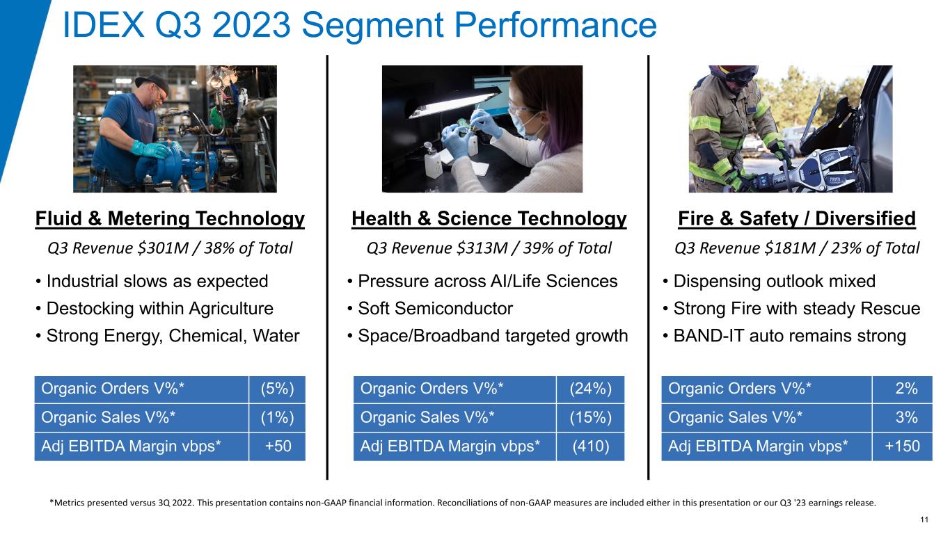 10IDEX Proprietary & Confidential Q3 2023 Adjusted EBITDA Walk Strong price/cost and cost containment mitigate volume headwind (Dollars in millions) *This presentation contains non-GAAP financial information. Reconciliations of non-GAAP measures are included either in this presentation or in our Q3 ‘23 earnings release. (a- Excludes Acquisistion, Divestiture, FX 18 3 8 9 (37) (6) 3Q'22 ACT ADJ EBITDA* Organic Flow Thru Price / Productivity / Inflation Mix Resource Investment / Discretionary Variable Compensation Acq/Div/ FX 3Q'23 ACT ADJ EBITDA* Flow through @ PY GM%* 45.1% Organic flow through-a) (31%) Total flow through (47%) 231 $ 226 $