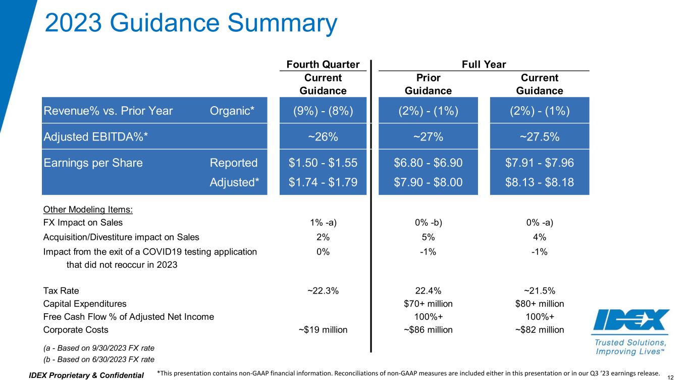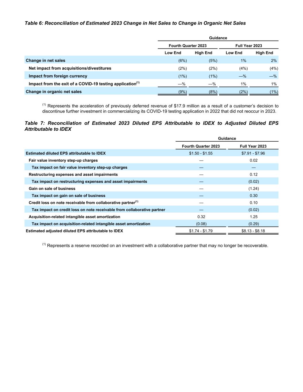 Table 6: Reconciliation of Estimated 2023 Change in Net Sales to Change in Organic Net Sales Guidance Fourth Quarter 2023 Full Year 2023 Low End High End Low End High End Change in net sales (6%) (5%) 1% 2% Net impact from acquisitions/divestitures (2%) (2%) (4%) (4%) Impact from foreign currency (1%) (1%) —% —% Impact from the exit of a COVID-19 testing application(1) —% —% 1% 1% Change in organic net sales (9%) (8%) (2%) (1%) (1) Represents the acceleration of previously deferred revenue of $17.9 million as a result of a customer’s decision to discontinue further investment in commercializing its COVID-19 testing application in 2022 that did not reoccur in 2023. Table 7: Reconciliation of Estimated 2023 Diluted EPS Attributable to IDEX to Adjusted Diluted EPS Attributable to IDEX Guidance Fourth Quarter 2023 Full Year 2023 Estimated diluted EPS attributable to IDEX $1.50 - $1.55 $7.91 - $7.96 Fair value inventory step-up charges — 0.02 Tax impact on fair value inventory step-up charges — — Restructuring expenses and asset impairments — 0.12 Tax impact on restructuring expenses and asset impairments — (0.02) Gain on sale of business — (1.24) Tax impact on gain on sale of business — 0.30 Credit loss on note receivable from collaborative partner(1) — 0.10 Tax impact on credit loss on note receivable from collaborative partner — (0.02) Acquisition-related intangible asset amortization 0.32 1.25 Tax impact on acquisition-related intangible asset amortization (0.08) (0.29) Estimated adjusted diluted EPS attributable to IDEX $1.74 - $1.79 $8.13 - $8.18 (1) Represents a reserve recorded on an investment with a collaborative partner that may no longer be recoverable.