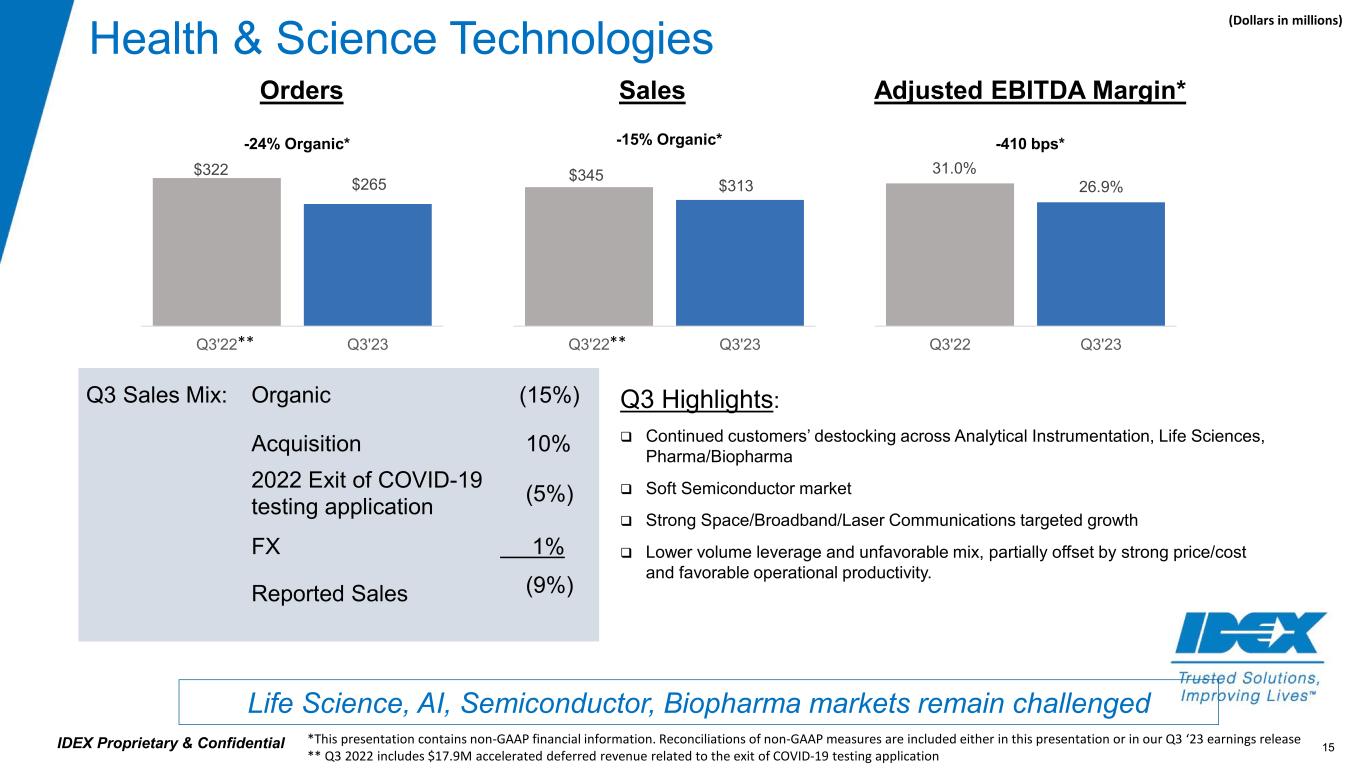 14IDEX Proprietary & Confidential Fluid & Metering Technologies Q3 Highlights:  Industrial market slowing as expected  Destocking within Agriculture market  Strong Chemical and Water markets  Steady Energy market with backlog burn  Strong price/cost and favorable operational productivity more than offset lower volume leverage Market slowing as expected with continued strong profitability (Dollars in millions) Q3 Sales Mix: Organic (1%) Acquisition/Divestiture (2%) FX 1% Reported Sales (2%) *This presentation contains non-GAAP financial information. Reconciliations of non-GAAP measures are included either in this presentation or in our Q3 ‘23 earnings release. 33.9% 34.4% Q3'22 Q3'23 Orders Sales Adjusted EBITDA Margin* $311 $294 Q3'22 Q3'23 +50 bps* $308 $301 Q3'22 Q3'23 -5% Organic* -1% Organic*