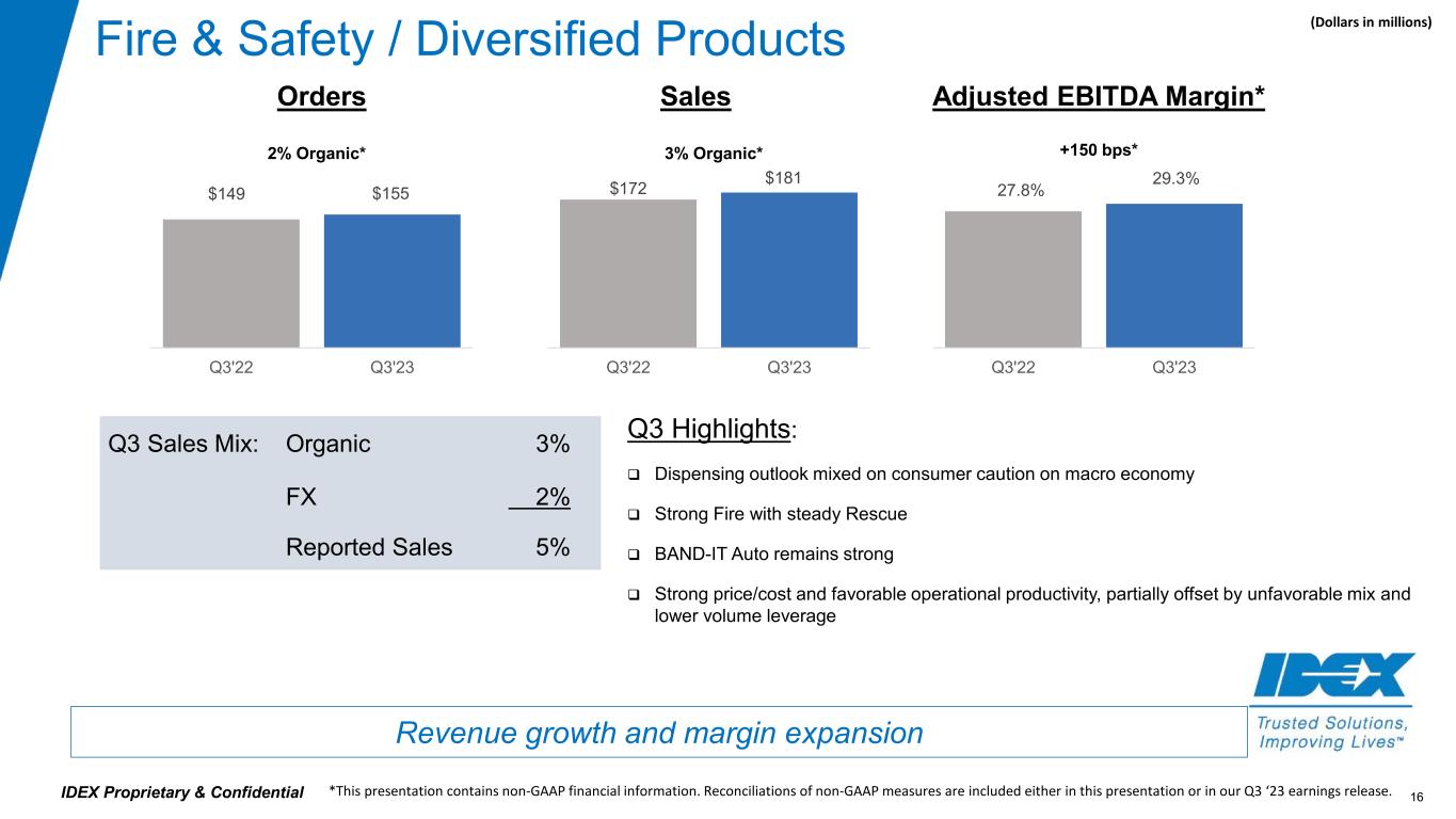 4IDEX Proprietary & Confidential Cautionary Statement Cautionary Statement Under the Private Securities Litigation Reform Act; Non-GAAP Measures This presentation contains “forward-looking” statements within the meaning of the Private Securities Litigation Reform Act of 1995, as amended. These statements may relate to, among other things, the Company’s fourth quarter 2023 and full year 2023 outlook including expected organic sales projections, expected earnings per share and adjusted earnings per share, and the assumptions underlying these expectations, anticipated future acquisition behavior, expectations regarding customer destocking efforts and future order stabilization and lead time, availability of cash and financing alternatives and the anticipated benefits of the Company’s recent acquisitions, and are indicated by words or phrases such as “anticipates,” “estimates,” “plans,” “guidance,” “expects,” “projects,” “forecasts,” “should,” “could,” “will,” “management believes,” “the Company believes,” “the Company intends” and similar words or phrases. These statements are subject to inherent uncertainties and risks that could cause actual results to differ materially from those anticipated at the date of this presentation. The risks and uncertainties include, but are not limited to, the following: levels of industrial activity and economic conditions in the U.S. and other countries around the world, including uncertainties in the financial markets and adverse developments affecting the financial services industry; pricing pressures, including inflation and rising interest rates, and other competitive factors and levels of capital spending in certain industries, all of which could have a material impact on order rates and the Company’s results; the impact of health epidemics and pandemics and terrorist attacks and wars, which could have an adverse impact on the Company's business by creating disruptions in the global supply chain and by potentially having an adverse impact on the global economy; the Company’s ability to make acquisitions and to integrate and operate acquired businesses on a profitable basis; the relationship of the U.S. dollar to other currencies and its impact on pricing and cost competitiveness; political and economic conditions in foreign countries in which the Company operates; developments with respect to trade policy and tariffs; capacity utilization and the effect this has on costs; labor markets; supply chain conditions; market conditions and material costs; risks related to environmental, social and corporate governance issues, including those related to climate change and sustainability; and developments with respect to contingencies, such as litigation and environmental matters. Additional factors that could cause actual results to differ materially from those reflected in the forward-looking statements include, but are not limited to, the risks discussed in the “Risk Factors” section included in the Company’s most recent annual report on Form 10-K and the Company’s subsequent quarterly reports filed with the Securities and Exchange Commission (“SEC”) and the other risks discussed in the Company’s filings with the SEC. The forward-looking statements included here are only made as of the date of this presentation, and management undertakes no obligation to publicly update them to reflect subsequent events or circumstances, except as may be required by law. Investors are cautioned not to rely unduly on forward-looking statements when evaluating the information presented here. This presentation contains non-GAAP financial information. Reconciliations of non-GAAP measures are included either in this presentation or our earnings release for the three-month period ending September 30, 2023, which is available on our website.