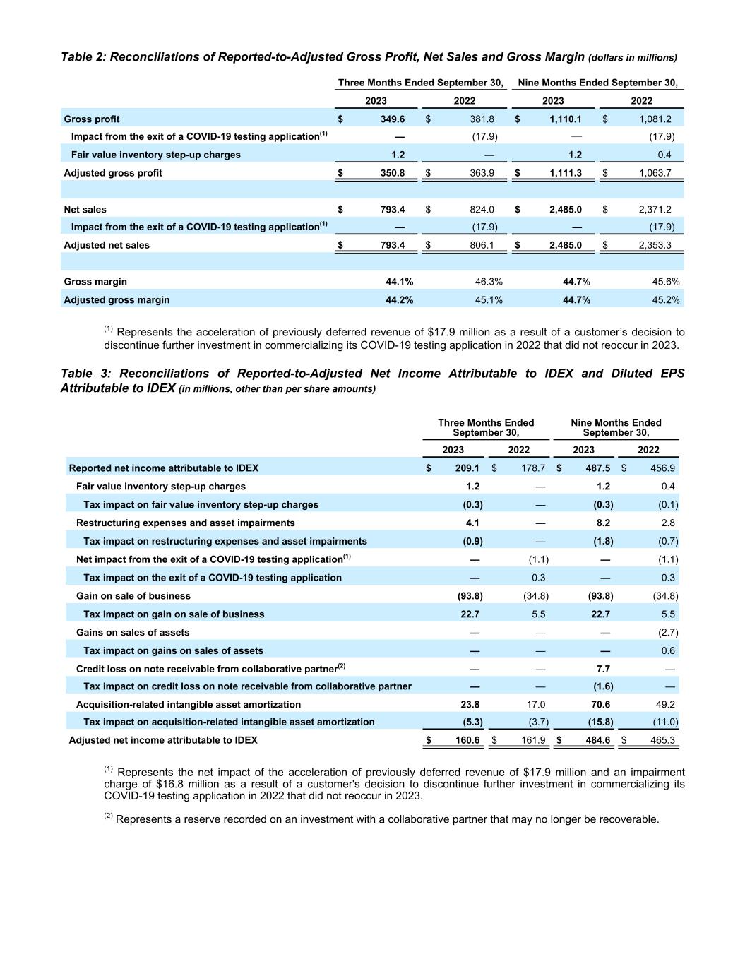 Table 2: Reconciliations of Reported-to-Adjusted Gross Profit, Net Sales and Gross Margin (dollars in millions) Three Months Ended September 30, Nine Months Ended September 30, 2023 2022 2023 2022 Gross profit $ 349.6 $ 381.8 $ 1,110.1 $ 1,081.2 Impact from the exit of a COVID-19 testing application(1) — (17.9) — (17.9) Fair value inventory step-up charges 1.2 — 1.2 0.4 Adjusted gross profit $ 350.8 $ 363.9 $ 1,111.3 $ 1,063.7 Net sales $ 793.4 $ 824.0 $ 2,485.0 $ 2,371.2 Impact from the exit of a COVID-19 testing application(1) — (17.9) — (17.9) Adjusted net sales $ 793.4 $ 806.1 $ 2,485.0 $ 2,353.3 Gross margin 44.1% 46.3% 44.7% 45.6% Adjusted gross margin 44.2% 45.1% 44.7% 45.2% (1) Represents the acceleration of previously deferred revenue of $17.9 million as a result of a customer’s decision to discontinue further investment in commercializing its COVID-19 testing application in 2022 that did not reoccur in 2023. Table 3: Reconciliations of Reported-to-Adjusted Net Income Attributable to IDEX and Diluted EPS Attributable to IDEX (in millions, other than per share amounts) Three Months Ended September 30, Nine Months Ended September 30, 2023 2022 2023 2022 Reported net income attributable to IDEX $ 209.1 $ 178.7 $ 487.5 $ 456.9 Fair value inventory step-up charges 1.2 — 1.2 0.4 Tax impact on fair value inventory step-up charges (0.3) — (0.3) (0.1) Restructuring expenses and asset impairments 4.1 — 8.2 2.8 Tax impact on restructuring expenses and asset impairments (0.9) — (1.8) (0.7) Net impact from the exit of a COVID-19 testing application(1) — (1.1) — (1.1) Tax impact on the exit of a COVID-19 testing application — 0.3 — 0.3 Gain on sale of business (93.8) (34.8) (93.8) (34.8) Tax impact on gain on sale of business 22.7 5.5 22.7 5.5 Gains on sales of assets — — — (2.7) Tax impact on gains on sales of assets — — — 0.6 Credit loss on note receivable from collaborative partner(2) — — 7.7 — Tax impact on credit loss on note receivable from collaborative partner — — (1.6) — Acquisition-related intangible asset amortization 23.8 17.0 70.6 49.2 Tax impact on acquisition-related intangible asset amortization (5.3) (3.7) (15.8) (11.0) Adjusted net income attributable to IDEX $ 160.6 $ 161.9 $ 484.6 $ 465.3 (1) Represents the net impact of the acceleration of previously deferred revenue of $17.9 million and an impairment charge of $16.8 million as a result of a customer's decision to discontinue further investment in commercializing its COVID-19 testing application in 2022 that did not reoccur in 2023. (2) Represents a reserve recorded on an investment with a collaborative partner that may no longer be recoverable.