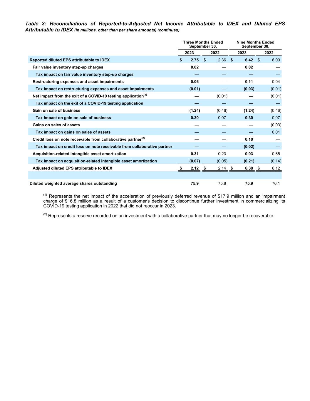 Table 3: Reconciliations of Reported-to-Adjusted Net Income Attributable to IDEX and Diluted EPS Attributable to IDEX (in millions, other than per share amounts) (continued) Three Months Ended September 30, Nine Months Ended September 30, 2023 2022 2023 2022 Reported diluted EPS attributable to IDEX $ 2.75 $ 2.36 $ 6.42 $ 6.00 Fair value inventory step-up charges 0.02 — 0.02 — Tax impact on fair value inventory step-up charges — — — — Restructuring expenses and asset impairments 0.06 — 0.11 0.04 Tax impact on restructuring expenses and asset impairments (0.01) — (0.03) (0.01) Net impact from the exit of a COVID-19 testing application(1) — (0.01) — (0.01) Tax impact on the exit of a COVID-19 testing application — — — — Gain on sale of business (1.24) (0.46) (1.24) (0.46) Tax impact on gain on sale of business 0.30 0.07 0.30 0.07 Gains on sales of assets — — — (0.03) Tax impact on gains on sales of assets — — — 0.01 Credit loss on note receivable from collaborative partner(2) — — 0.10 — Tax impact on credit loss on note receivable from collaborative partner — — (0.02) — Acquisition-related intangible asset amortization 0.31 0.23 0.93 0.65 Tax impact on acquisition-related intangible asset amortization (0.07) (0.05) (0.21) (0.14) Adjusted diluted EPS attributable to IDEX $ 2.12 $ 2.14 $ 6.38 $ 6.12 Diluted weighted average shares outstanding 75.9 75.8 75.9 76.1 (1) Represents the net impact of the acceleration of previously deferred revenue of $17.9 million and an impairment charge of $16.8 million as a result of a customer's decision to discontinue further investment in commercializing its COVID-19 testing application in 2022 that did not reoccur in 2023. (2) Represents a reserve recorded on an investment with a collaborative partner that may no longer be recoverable.