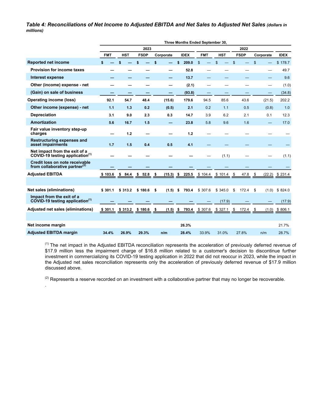 Table 4: Reconciliations of Net Income to Adjusted EBITDA and Net Sales to Adjusted Net Sales (dollars in millions) Three Months Ended September 30, 2023 2022 FMT HST FSDP Corporate IDEX FMT HST FSDP Corporate IDEX Reported net income $ — $ — $ — $ — $ 209.0 $ — $ — $ — $ — $ 178.7 Provision for income taxes — — — — 52.8 — — — — 49.7 Interest expense — — — — 13.7 — — — — 9.6 Other (income) expense - net — — — — (2.1) — — — — (1.0) (Gain) on sale of business — — — — (93.8) — — — — (34.8) Operating income (loss) 92.1 54.7 48.4 (15.6) 179.6 94.5 85.6 43.6 (21.5) 202.2 Other income (expense) - net 1.1 1.3 0.2 (0.5) 2.1 0.2 1.1 0.5 (0.8) 1.0 Depreciation 3.1 9.0 2.3 0.3 14.7 3.9 6.2 2.1 0.1 12.3 Amortization 5.6 16.7 1.5 — 23.8 5.8 9.6 1.6 — 17.0 Fair value inventory step-up charges — 1.2 — — 1.2 — — — — — Restructuring expenses and asset impairments 1.7 1.5 0.4 0.5 4.1 — — — — — Net impact from the exit of a COVID-19 testing application(1) — — — — — — (1.1) — — (1.1) Credit loss on note receivable from collaborative partner(2) — — — — — — — — — — Adjusted EBITDA $ 103.6 $ 84.4 $ 52.8 $ (15.3) $ 225.5 $ 104.4 $ 101.4 $ 47.8 $ (22.2) $ 231.4 Net sales (eliminations) $ 301.1 $ 313.2 $ 180.6 $ (1.5) $ 793.4 $ 307.6 $ 345.0 $ 172.4 $ (1.0) $ 824.0 Impact from the exit of a COVID-19 testing application(1) — — — — — — (17.9) — — (17.9) Adjusted net sales (eliminations) $ 301.1 $ 313.2 $ 180.6 $ (1.5) $ 793.4 $ 307.6 $ 327.1 $ 172.4 $ (1.0) $ 806.1 Net income margin 26.3% 21.7% Adjusted EBITDA margin 34.4% 26.9% 29.3% n/m 28.4% 33.9% 31.0% 27.8% n/m 28.7% (1) The net impact in the Adjusted EBITDA reconciliation represents the acceleration of previously deferred revenue of $17.9 million less the impairment charge of $16.8 million related to a customer's decision to discontinue further investment in commercializing its COVID-19 testing application in 2022 that did not reoccur in 2023, while the impact in the Adjusted net sales reconciliation represents only the acceleration of previously deferred revenue of $17.9 million discussed above. (2) Represents a reserve recorded on an investment with a collaborative partner that may no longer be recoverable. .