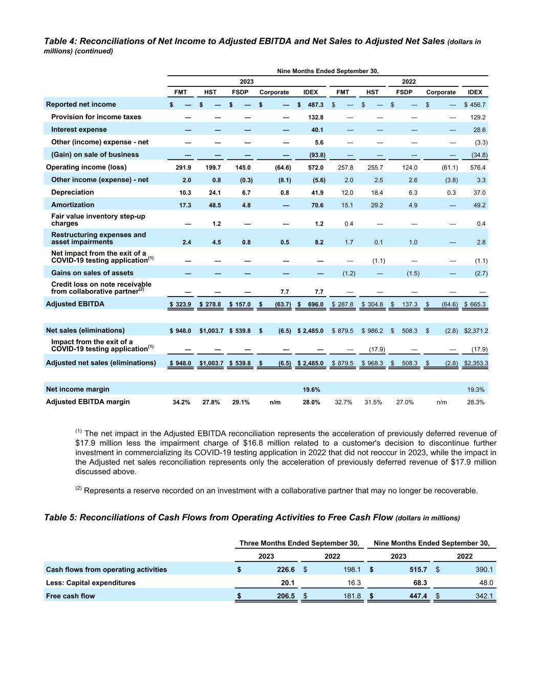 Table 4: Reconciliations of Net Income to Adjusted EBITDA and Net Sales to Adjusted Net Sales (dollars in millions) (continued) Nine Months Ended September 30, 2023 2022 FMT HST FSDP Corporate IDEX FMT HST FSDP Corporate IDEX Reported net income $ — $ — $ — $ — $ 487.3 $ — $ — $ — $ — $ 456.7 Provision for income taxes — — — — 132.8 — — — — 129.2 Interest expense — — — — 40.1 — — — — 28.6 Other (income) expense - net — — — — 5.6 — — — — (3.3) (Gain) on sale of business — — — — (93.8) — — — — (34.8) Operating income (loss) 291.9 199.7 145.0 (64.6) 572.0 257.8 255.7 124.0 (61.1) 576.4 Other income (expense) - net 2.0 0.8 (0.3) (8.1) (5.6) 2.0 2.5 2.6 (3.8) 3.3 Depreciation 10.3 24.1 6.7 0.8 41.9 12.0 18.4 6.3 0.3 37.0 Amortization 17.3 48.5 4.8 — 70.6 15.1 29.2 4.9 — 49.2 Fair value inventory step-up charges — 1.2 — — 1.2 0.4 — — — 0.4 Restructuring expenses and asset impairments 2.4 4.5 0.8 0.5 8.2 1.7 0.1 1.0 — 2.8 Net impact from the exit of a COVID-19 testing application(1) — — — — — — (1.1) — — (1.1) Gains on sales of assets — — — — — (1.2) — (1.5) — (2.7) Credit loss on note receivable from collaborative partner(2) — — — 7.7 7.7 — — — — — Adjusted EBITDA $ 323.9 $ 278.8 $ 157.0 $ (63.7) $ 696.0 $ 287.8 $ 304.8 $ 137.3 $ (64.6) $ 665.3 Net sales (eliminations) $ 948.0 $ 1,003.7 $ 539.8 $ (6.5) $ 2,485.0 $ 879.5 $ 986.2 $ 508.3 $ (2.8) $ 2,371.2 Impact from the exit of a COVID-19 testing application(1) — — — — — — (17.9) — — (17.9) Adjusted net sales (eliminations) $ 948.0 $ 1,003.7 $ 539.8 $ (6.5) $ 2,485.0 $ 879.5 $ 968.3 $ 508.3 $ (2.8) $ 2,353.3 Net income margin 19.6% 19.3% Adjusted EBITDA margin 34.2% 27.8% 29.1% n/m 28.0% 32.7% 31.5% 27.0% n/m 28.3% (1) The net impact in the Adjusted EBITDA reconciliation represents the acceleration of previously deferred revenue of $17.9 million less the impairment charge of $16.8 million related to a customer's decision to discontinue further investment in commercializing its COVID-19 testing application in 2022 that did not reoccur in 2023, while the impact in the Adjusted net sales reconciliation represents only the acceleration of previously deferred revenue of $17.9 million discussed above. (2) Represents a reserve recorded on an investment with a collaborative partner that may no longer be recoverable. Table 5: Reconciliations of Cash Flows from Operating Activities to Free Cash Flow (dollars in millions) Three Months Ended September 30, Nine Months Ended September 30, 2023 2022 2023 2022 Cash flows from operating activities $ 226.6 $ 198.1 $ 515.7 $ 390.1 Less: Capital expenditures 20.1 16.3 68.3 48.0 Free cash flow $ 206.5 $ 181.8 $ 447.4 $ 342.1