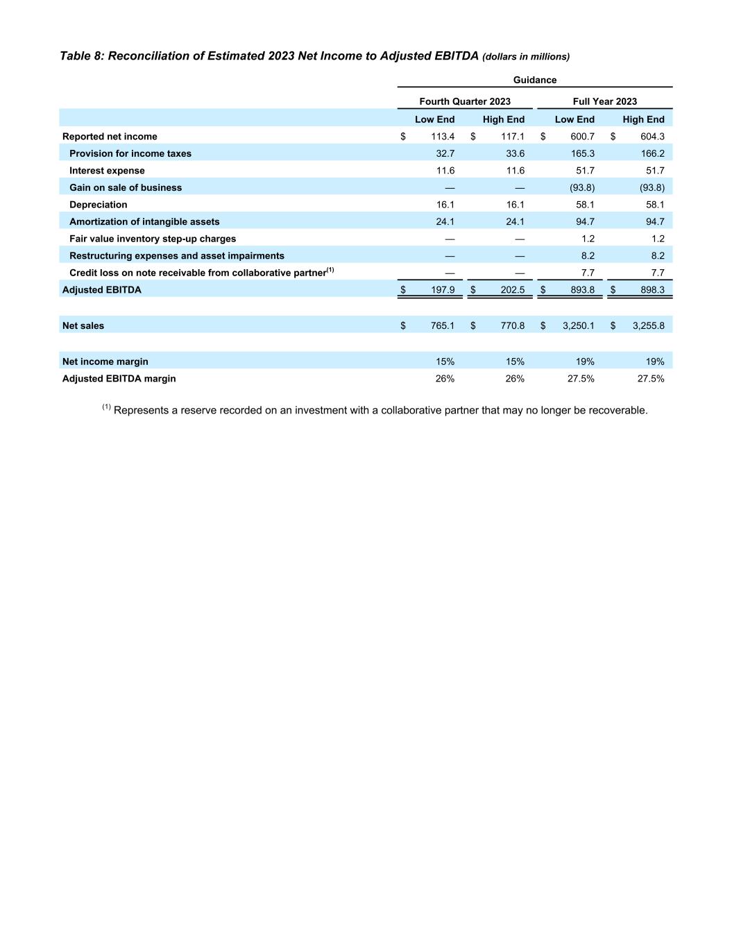 Table 8: Reconciliation of Estimated 2023 Net Income to Adjusted EBITDA (dollars in millions) Guidance Fourth Quarter 2023 Full Year 2023 Low End High End Low End High End Reported net income $ 113.4 $ 117.1 $ 600.7 $ 604.3 Provision for income taxes 32.7 33.6 165.3 166.2 Interest expense 11.6 11.6 51.7 51.7 Gain on sale of business — — (93.8) (93.8) Depreciation 16.1 16.1 58.1 58.1 Amortization of intangible assets 24.1 24.1 94.7 94.7 Fair value inventory step-up charges — — 1.2 1.2 Restructuring expenses and asset impairments — — 8.2 8.2 Credit loss on note receivable from collaborative partner(1) — — 7.7 7.7 Adjusted EBITDA $ 197.9 $ 202.5 $ 893.8 $ 898.3 Net sales $ 765.1 $ 770.8 $ 3,250.1 $ 3,255.8 Net income margin 15 % 15 % 19 % 19 % Adjusted EBITDA margin 26 % 26 % 27.5 % 27.5 % (1) Represents a reserve recorded on an investment with a collaborative partner that may no longer be recoverable.