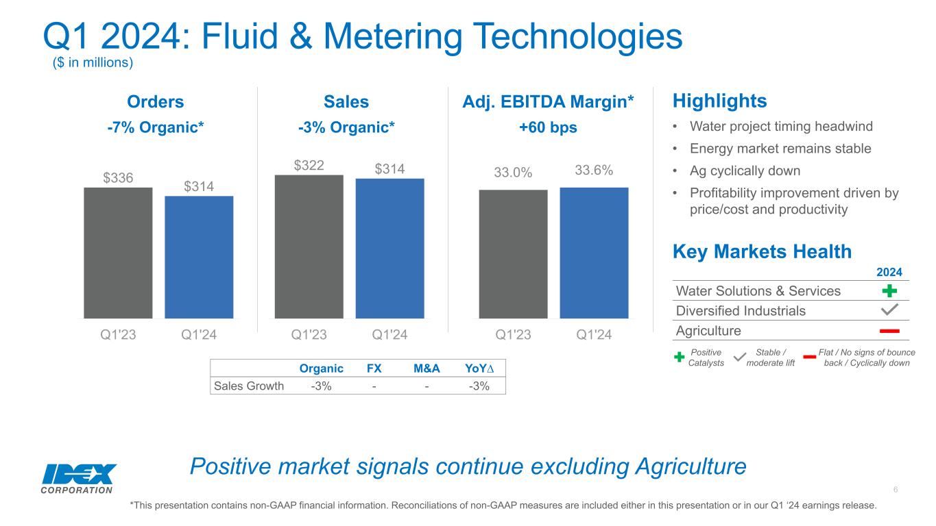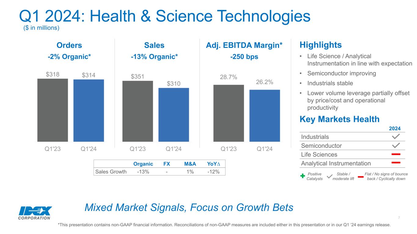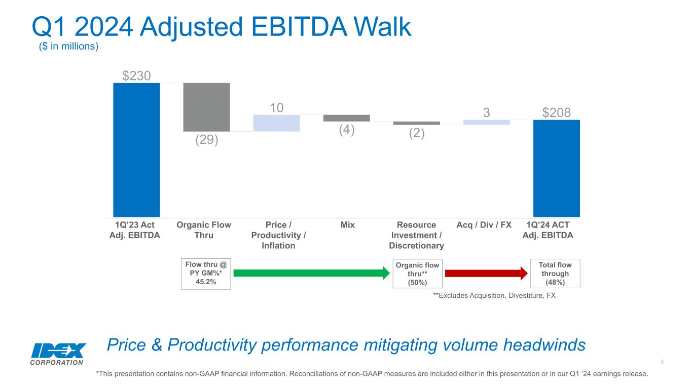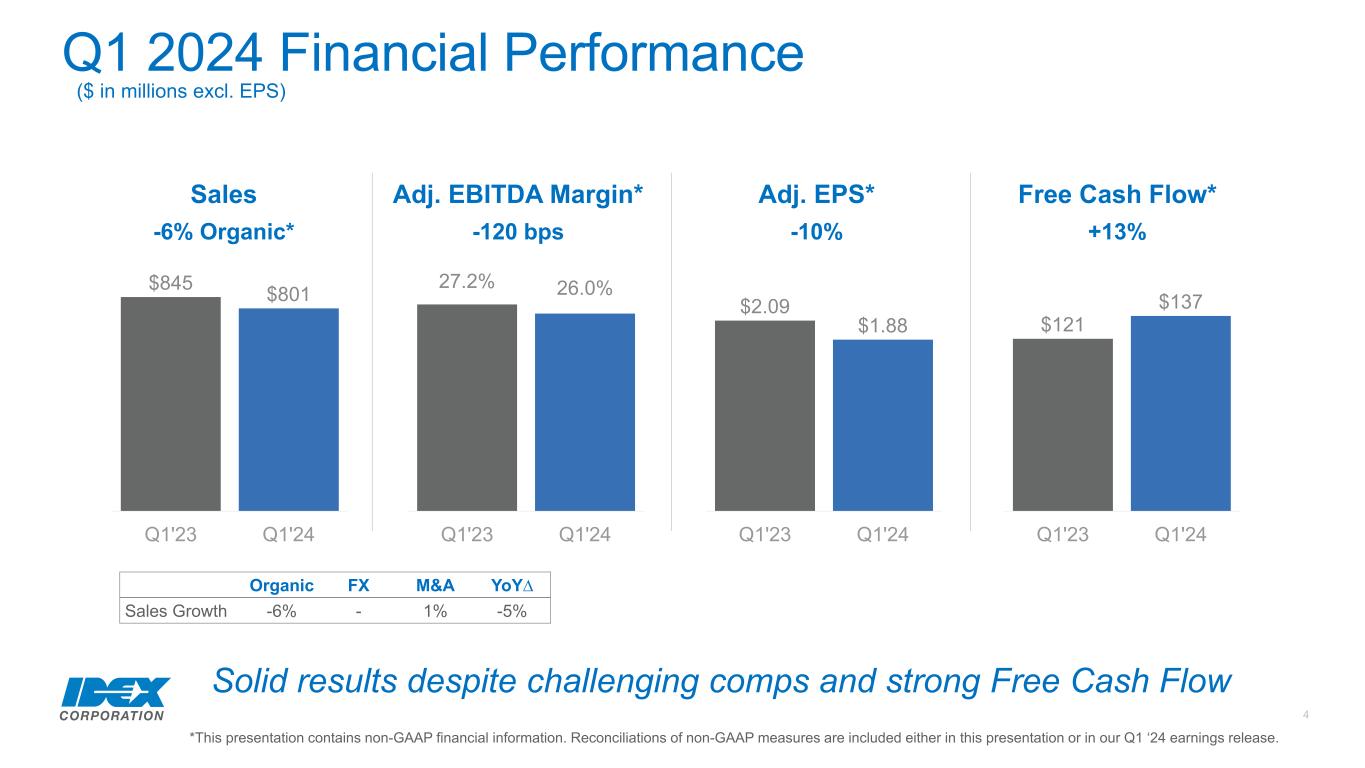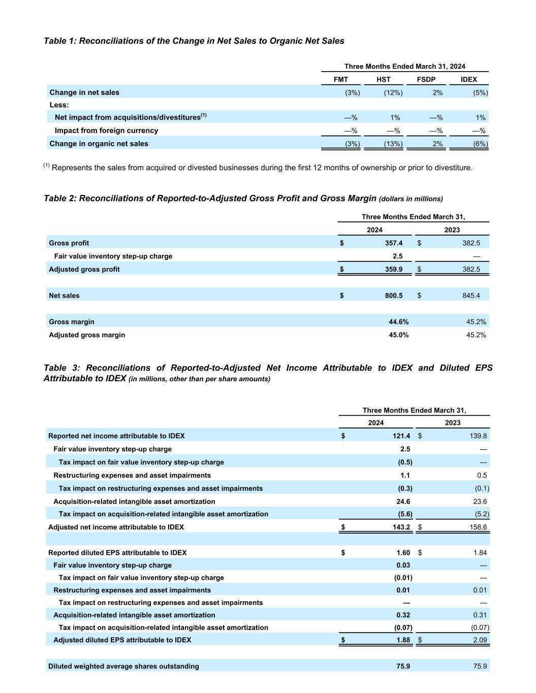 Table 1: Reconciliations of the Change in Net Sales to Organic Net Sales Three Months Ended March 31, 2024 FMT HST FSDP IDEX Change in net sales (3%) (12%) 2% (5%) Less: Net impact from acquisitions/divestitures(1) —% 1% —% 1% Impact from foreign currency —% —% —% —% Change in organic net sales (3%) (13%) 2% (6%) (1) Represents the sales from acquired or divested businesses during the first 12 months of ownership or prior to divestiture. Table 2: Reconciliations of Reported-to-Adjusted Gross Profit and Gross Margin (dollars in millions) Three Months Ended March 31, 2024 2023 Gross profit $ 357.4 $ 382.5 Fair value inventory step-up charge 2.5 — Adjusted gross profit $ 359.9 $ 382.5 Net sales $ 800.5 $ 845.4 Gross margin 44.6% 45.2% Adjusted gross margin 45.0% 45.2% Table 3: Reconciliations of Reported-to-Adjusted Net Income Attributable to IDEX and Diluted EPS Attributable to IDEX (in millions, other than per share amounts) Three Months Ended March 31, 2024 2023 Reported net income attributable to IDEX $ 121.4 $ 139.8 Fair value inventory step-up charge 2.5 — Tax impact on fair value inventory step-up charge (0.5) — Restructuring expenses and asset impairments 1.1 0.5 Tax impact on restructuring expenses and asset impairments (0.3) (0.1) Acquisition-related intangible asset amortization 24.6 23.6 Tax impact on acquisition-related intangible asset amortization (5.6) (5.2) Adjusted net income attributable to IDEX $ 143.2 $ 158.6 Reported diluted EPS attributable to IDEX $ 1.60 $ 1.84 Fair value inventory step-up charge 0.03 — Tax impact on fair value inventory step-up charge (0.01) — Restructuring expenses and asset impairments 0.01 0.01 Tax impact on restructuring expenses and asset impairments — — Acquisition-related intangible asset amortization 0.32 0.31 Tax impact on acquisition-related intangible asset amortization (0.07) (0.07) Adjusted diluted EPS attributable to IDEX $ 1.88 $ 2.09 Diluted weighted average shares outstanding 75.9 75.9