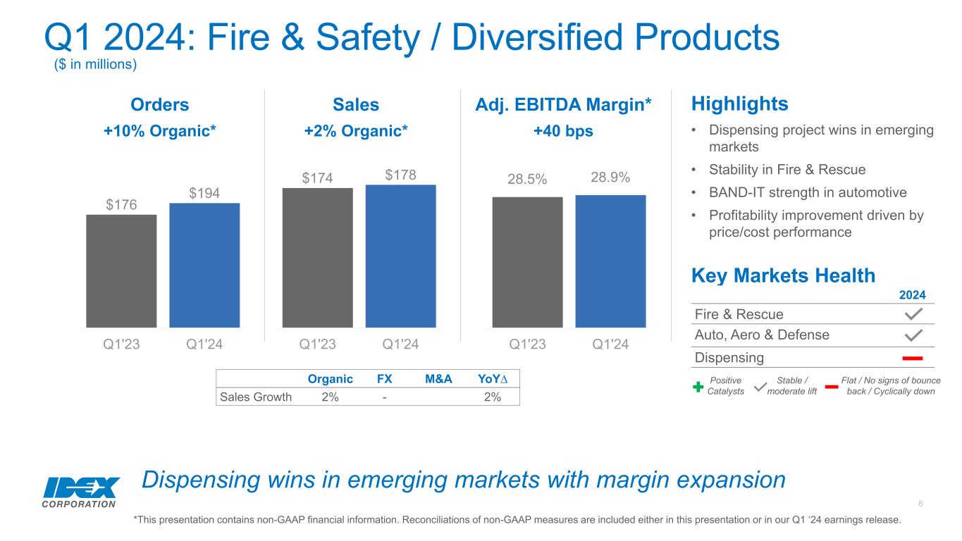 Click Here to Edit TitleQ1 2024: Health & Science Technologies 7 ($ in millions) $351 $310 Q1'23 Q1'24 Sales -13% Organic* *This presentation contains non-GAAP financial information. Reconciliations of non-GAAP measures are included either in this presentation or in our Q1 ‘24 earnings release. 28.7% 26.2% Q1'23 Q1'24 Adj. EBITDA Margin* -250 bps Mixed Market Signals, Focus on Growth Bets $318 $314 Q1'23 Q1'24 Orders -2% Organic* Organic FX M&A YoY∆ Sales Growth -13% - 1% -12% Highlights • Life Science / Analytical Instrumentation in line with expectation • Semiconductor improving • Industrials stable • Lower volume leverage partially offset by price/cost and operational productivity Key Markets Health 2024 Industrials Semiconductor Life Sciences Analytical Instrumentation Positive Catalysts Stable / moderate lift Flat / No signs of bounce back / Cyclically down