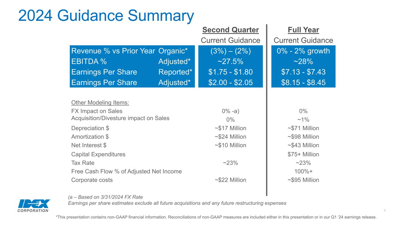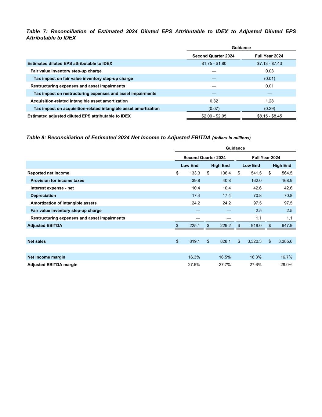 Table 7: Reconciliation of Estimated 2024 Diluted EPS Attributable to IDEX to Adjusted Diluted EPS Attributable to IDEX Guidance Second Quarter 2024 Full Year 2024 Estimated diluted EPS attributable to IDEX $1.75 - $1.80 $7.13 - $7.43 Fair value inventory step-up charge — 0.03 Tax impact on fair value inventory step-up charge — (0.01) Restructuring expenses and asset impairments — 0.01 Tax impact on restructuring expenses and asset impairments — — Acquisition-related intangible asset amortization 0.32 1.28 Tax impact on acquisition-related intangible asset amortization (0.07) (0.29) Estimated adjusted diluted EPS attributable to IDEX $2.00 - $2.05 $8.15 - $8.45 Table 8: Reconciliation of Estimated 2024 Net Income to Adjusted EBITDA (dollars in millions) Guidance Second Quarter 2024 Full Year 2024 Low End High End Low End High End Reported net income $ 133.3 $ 136.4 $ 541.5 $ 564.5 Provision for income taxes 39.8 40.8 162.0 168.9 Interest expense - net 10.4 10.4 42.6 42.6 Depreciation 17.4 17.4 70.8 70.8 Amortization of intangible assets 24.2 24.2 97.5 97.5 Fair value inventory step-up charge — — 2.5 2.5 Restructuring expenses and asset impairments — — 1.1 1.1 Adjusted EBITDA $ 225.1 $ 229.2 $ 918.0 $ 947.9 Net sales $ 819.1 $ 828.1 $ 3,320.3 $ 3,385.6 Net income margin 16.3 % 16.5 % 16.3 % 16.7 % Adjusted EBITDA margin 27.5 % 27.7 % 27.6 % 28.0 %