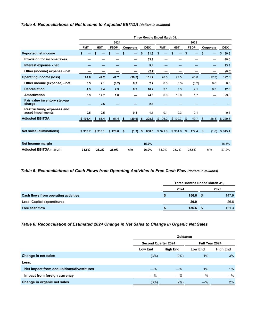 Table 4: Reconciliations of Net Income to Adjusted EBITDA (dollars in millions) Three Months Ended March 31, 2024 2023 FMT HST FSDP Corporate IDEX FMT HST FSDP Corporate IDEX Reported net income $ — $ — $ — $ — $ 121.3 $ — $ — $ — $ — $ 139.8 Provision for income taxes — — — — 33.2 — — — — 40.0 Interest expense - net — — — — 9.4 — — — — 13.1 Other (income) expense - net — — — — (2.7) — — — — (0.6) Operating income (loss) 94.8 49.2 47.7 (30.5) 161.2 96.5 77.5 46.0 (27.7) 192.3 Other income (expense) - net 0.5 2.1 (0.2) 0.3 2.7 0.5 (0.3) (0.2) 0.6 0.6 Depreciation 4.3 9.4 2.3 0.2 16.2 3.1 7.3 2.1 0.3 12.8 Amortization 5.3 17.7 1.6 — 24.6 6.0 15.9 1.7 — 23.6 Fair value inventory step-up charge — 2.5 — — 2.5 — — — — — Restructuring expenses and asset impairments 0.5 0.5 — 0.1 1.1 0.1 0.3 0.1 — 0.5 Adjusted EBITDA $ 105.4 $ 81.4 $ 51.4 $ (29.9) $ 208.3 $ 106.2 $ 100.7 $ 49.7 $ (26.8) $ 229.8 Net sales (eliminations) $ 313.7 $ 310.1 $ 178.0 $ (1.3) $ 800.5 $ 321.8 $ 351.0 $ 174.4 $ (1.8) $ 845.4 Net income margin 15.2% 16.5% Adjusted EBITDA margin 33.6% 26.2% 28.9% n/m 26.0% 33.0% 28.7% 28.5% n/m 27.2% Table 5: Reconciliations of Cash Flows from Operating Activities to Free Cash Flow (dollars in millions) Three Months Ended March 31, 2024 2023 Cash flows from operating activities $ 156.6 $ 147.9 Less: Capital expenditures 20.0 26.6 Free cash flow $ 136.6 $ 121.3 Table 6: Reconciliation of Estimated 2024 Change in Net Sales to Change in Organic Net Sales Guidance Second Quarter 2024 Full Year 2024 Low End High End Low End High End Change in net sales (3%) (2%) 1% 3% Less: Net impact from acquisitions/divestitures —% —% 1% 1% Impact from foreign currency —% —% —% —% Change in organic net sales (3%) (2%) —% 2%