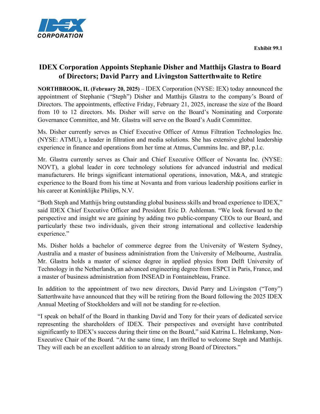 Exhibit 99.1 IDEX Corporation Appoints Stephanie Disher and Matthijs Glastra to Board of Directors; David Parry and Livingston Satterthwaite to Retire NORTHBROOK, IL (February 20, 2025) – IDEX Corporation (NYSE: IEX) today announced the appointment of Stephanie (“Steph”) Disher and Matthijs Glastra to the company’s Board of Directors. The appointments, effective Friday, February 21, 2025, increase the size of the Board from 10 to 12 directors. Ms. Disher will serve on the Board’s Nominating and Corporate Governance Committee, and Mr. Glastra will serve on the Board’s Audit Committee. Ms. Disher currently serves as Chief Executive Officer of Atmus Filtration Technologies Inc. (NYSE: ATMU), a leader in filtration and media solutions. She has extensive global leadership experience in finance and operations from her time at Atmus, Cummins Inc. and BP, p.l.c. Mr. Glastra currently serves as Chair and Chief Executive Officer of Novanta Inc. (NYSE: NOVT), a global leader in core technology solutions for advanced industrial and medical manufacturers. He brings significant international operations, innovation, M&A, and strategic experience to the Board from his time at Novanta and from various leadership positions earlier in his career at Koninklijke Philips, N.V. “Both Steph and Matthijs bring outstanding global business skills and broad experience to IDEX,” said IDEX Chief Executive Officer and President Eric D. Ashleman. “We look forward to the perspective and insight we are gaining by adding two public-company CEOs to our Board, and particularly these two individuals, given their strong international and collective leadership experience.” Ms. Disher holds a bachelor of commerce degree from the University of Western Sydney, Australia and a master of business administration from the University of Melbourne, Australia. Mr. Glastra holds a master of science degree in applied physics from Delft University of Technology in the Netherlands, an advanced engineering degree from ESPCI in Paris, France, and a master of business administration from INSEAD in Fontainebleau, France. In addition to the appointment of two new directors, David Parry and Livingston (“Tony”) Satterthwaite have announced that they will be retiring from the Board following the 2025 IDEX Annual Meeting of Stockholders and will not be standing for re-election. “I speak on behalf of the Board in thanking David and Tony for their years of dedicated service representing the shareholders of IDEX. Their perspectives and oversight have contributed significantly to IDEX’s success during their time on the Board,” said Katrina L. Helmkamp, Non- Executive Chair of the Board. “At the same time, I am thrilled to welcome Steph and Matthijs. They will each be an excellent addition to an already strong Board of Directors.”