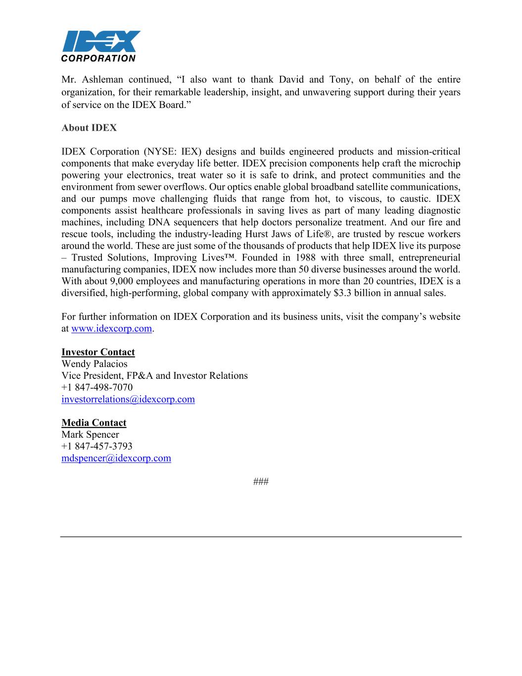 Mr. Ashleman continued, “I also want to thank David and Tony, on behalf of the entire organization, for their remarkable leadership, insight, and unwavering support during their years of service on the IDEX Board.” About IDEX IDEX Corporation (NYSE: IEX) designs and builds engineered products and mission-critical components that make everyday life better. IDEX precision components help craft the microchip powering your electronics, treat water so it is safe to drink, and protect communities and the environment from sewer overflows. Our optics enable global broadband satellite communications, and our pumps move challenging fluids that range from hot, to viscous, to caustic. IDEX components assist healthcare professionals in saving lives as part of many leading diagnostic machines, including DNA sequencers that help doctors personalize treatment. And our fire and rescue tools, including the industry-leading Hurst Jaws of Life®, are trusted by rescue workers around the world. These are just some of the thousands of products that help IDEX live its purpose – Trusted Solutions, Improving Lives™. Founded in 1988 with three small, entrepreneurial manufacturing companies, IDEX now includes more than 50 diverse businesses around the world. With about 9,000 employees and manufacturing operations in more than 20 countries, IDEX is a diversified, high-performing, global company with approximately $3.3 billion in annual sales. For further information on IDEX Corporation and its business units, visit the company’s website at www.idexcorp.com. Investor Contact Wendy Palacios Vice President, FP&A and Investor Relations +1 847-498-7070 investorrelations@idexcorp.com Media Contact Mark Spencer +1 847-457-3793 mdspencer@idexcorp.com ###