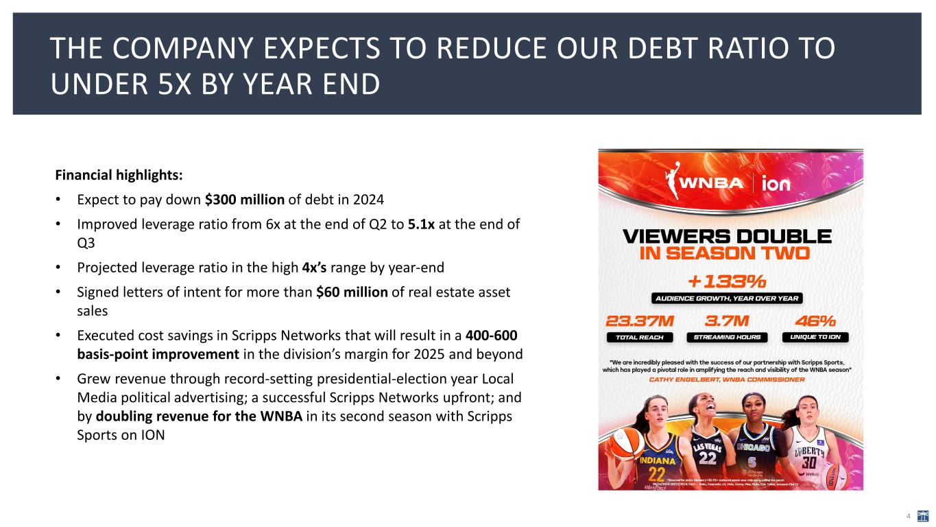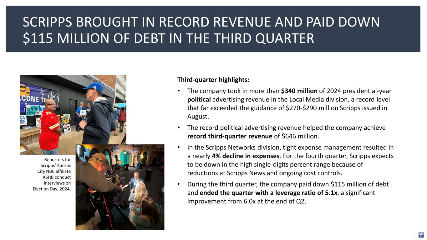 Third-quarter highlights: • The company took in more than $340 million of 2024 presidential-year political advertising revenue in the Local Media division, a record level that far exceeded the guidance of $270-$290 million Scripps issued in August. • The record political advertising revenue helped the company achieve record third-quarter revenue of $646 million. • In the Scripps Networks division, tight expense management resulted in a nearly 4% decline in expenses. For the fourth quarter, Scripps expects to be down in the high single-digits percent range because of reductions at Scripps News and ongoing cost controls. • During the third quarter, the company paid down $115 million of debt and ended the quarter with a leverage ratio of 5.1x, a significant improvement from 6.0x at the end of Q2. SCRIPPS BROUGHT IN RECORD REVENUE AND PAID DOWN $115 MILLION OF DEBT IN THE THIRD QUARTER 3 Reporters for Scripps’ Kansas City NBC affiliate KSHB conduct interviews on Election Day, 2024.