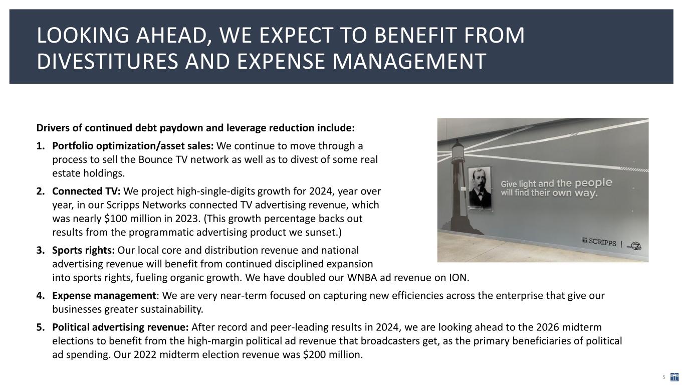 Financial highlights: • Expect to pay down $300 million of debt in 2024 • Improved leverage ratio from 6x at the end of Q2 to 5.1x at the end of Q3 • Projected leverage ratio in the high 4x’s range by year-end • Signed letters of intent for more than $60 million of real estate asset sales • Executed cost savings in Scripps Networks that will result in a 400-600 basis-point improvement in the division’s margin for 2025 and beyond • Grew revenue through record-setting presidential-election year Local Media political advertising; a successful Scripps Networks upfront; and by doubling revenue for the WNBA in its second season with Scripps Sports on ION THE COMPANY EXPECTS TO REDUCE OUR DEBT RATIO TO UNDER 5X BY YEAR END 4