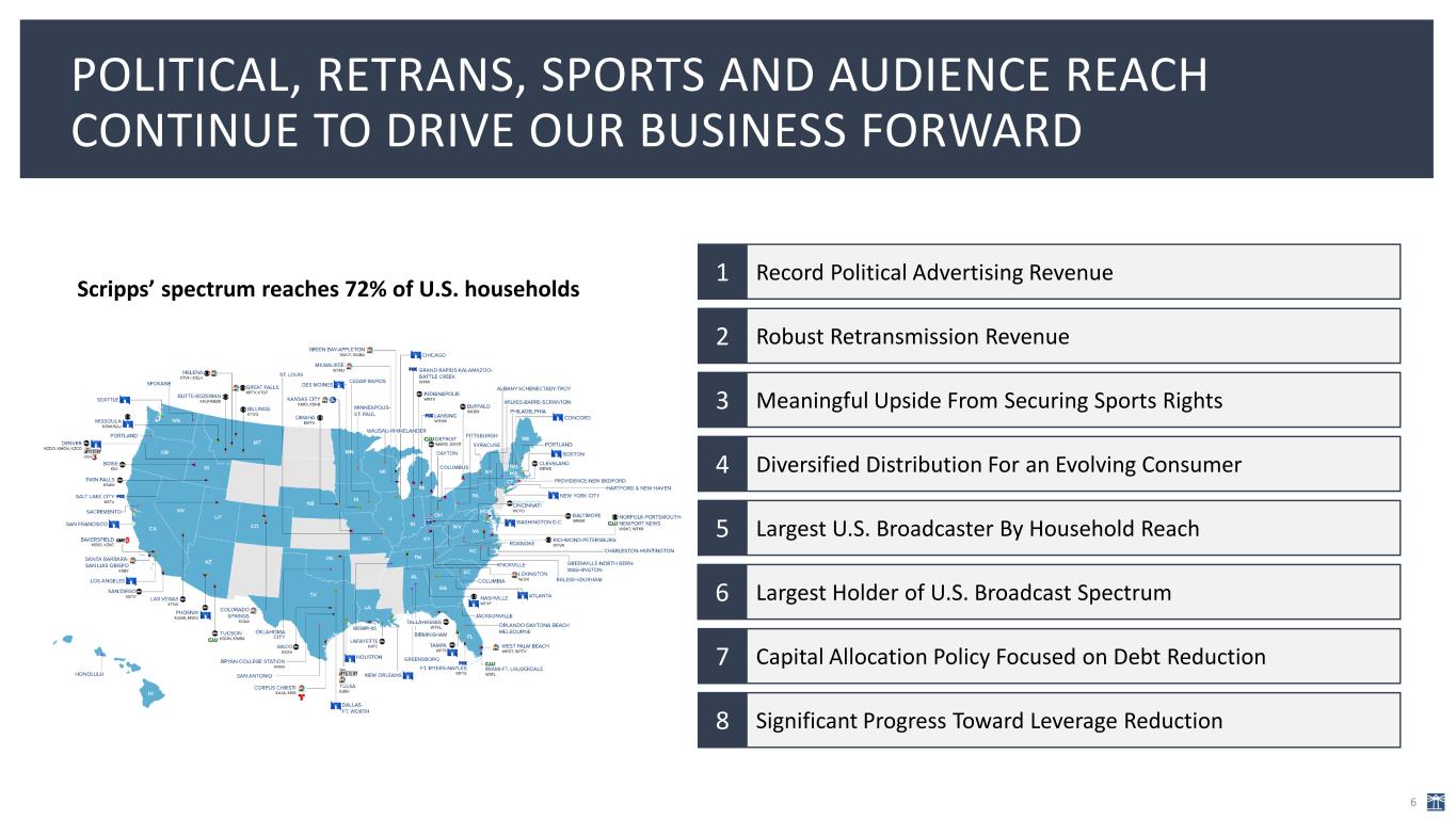 LOOKING AHEAD, WE EXPECT TO BENEFIT FROM DIVESTITURES AND EXPENSE MANAGEMENT 5 Drivers of continued debt paydown and leverage reduction include: 1. Portfolio optimization/asset sales: We continue to move through a process to sell the Bounce TV network as well as to divest of some real estate holdings. 2. Connected TV: We project high-single-digits growth for 2024, year over year, in our Scripps Networks connected TV advertising revenue, which was nearly $100 million in 2023. (This growth percentage backs out results from the programmatic advertising product we sunset.) 3. Sports rights: Our local core and distribution revenue and national advertising revenue will benefit from continued disciplined expansion into sports rights, fueling organic growth. We have doubled our WNBA ad revenue on ION. 4. Expense management: We are very near-term focused on capturing new efficiencies across the enterprise that give our businesses greater sustainability. 5. Political advertising revenue: After record and peer-leading results in 2024, we are looking ahead to the 2026 midterm elections to benefit from the high-margin political ad revenue that broadcasters get, as the primary beneficiaries of political ad spending. Our 2022 midterm election revenue was $200 million.